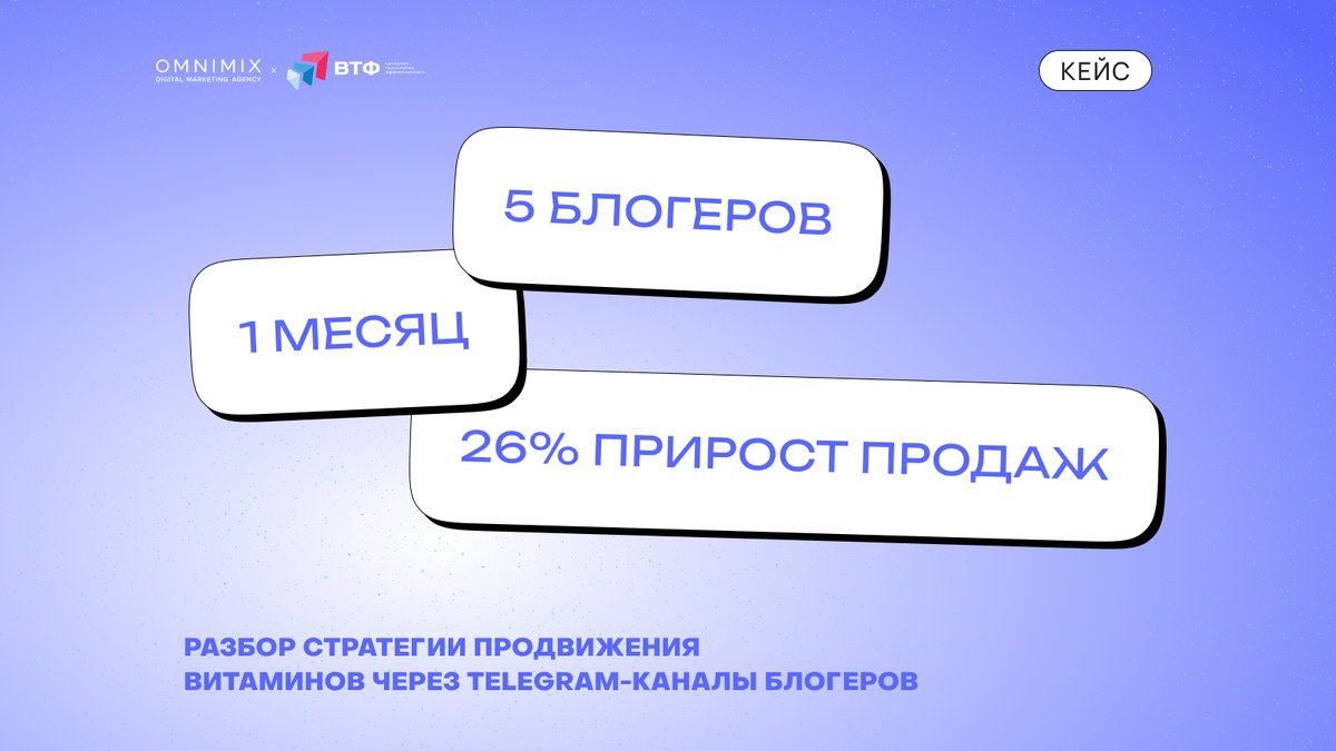 Рынок витаминов и БАДов в России растёт на 15–20% ежегодно, но конкуренция на маркетплейсах достигла пика. Классическая контекстная реклама даёт всё меньше отдачи, а доверие к прямой рекламе падает. В этих условиях бренды ищут новые каналы коммуникации с аудиторией. Мы провели кампанию для производителя витаминов Vitime и доказали: стратегически выстроенные интеграции с блогерами в Telegram дают измеримый результат: +26% к продажам и охват более 153 000 человек. Этот кейс – пошаговый разбор механики, которая работает.