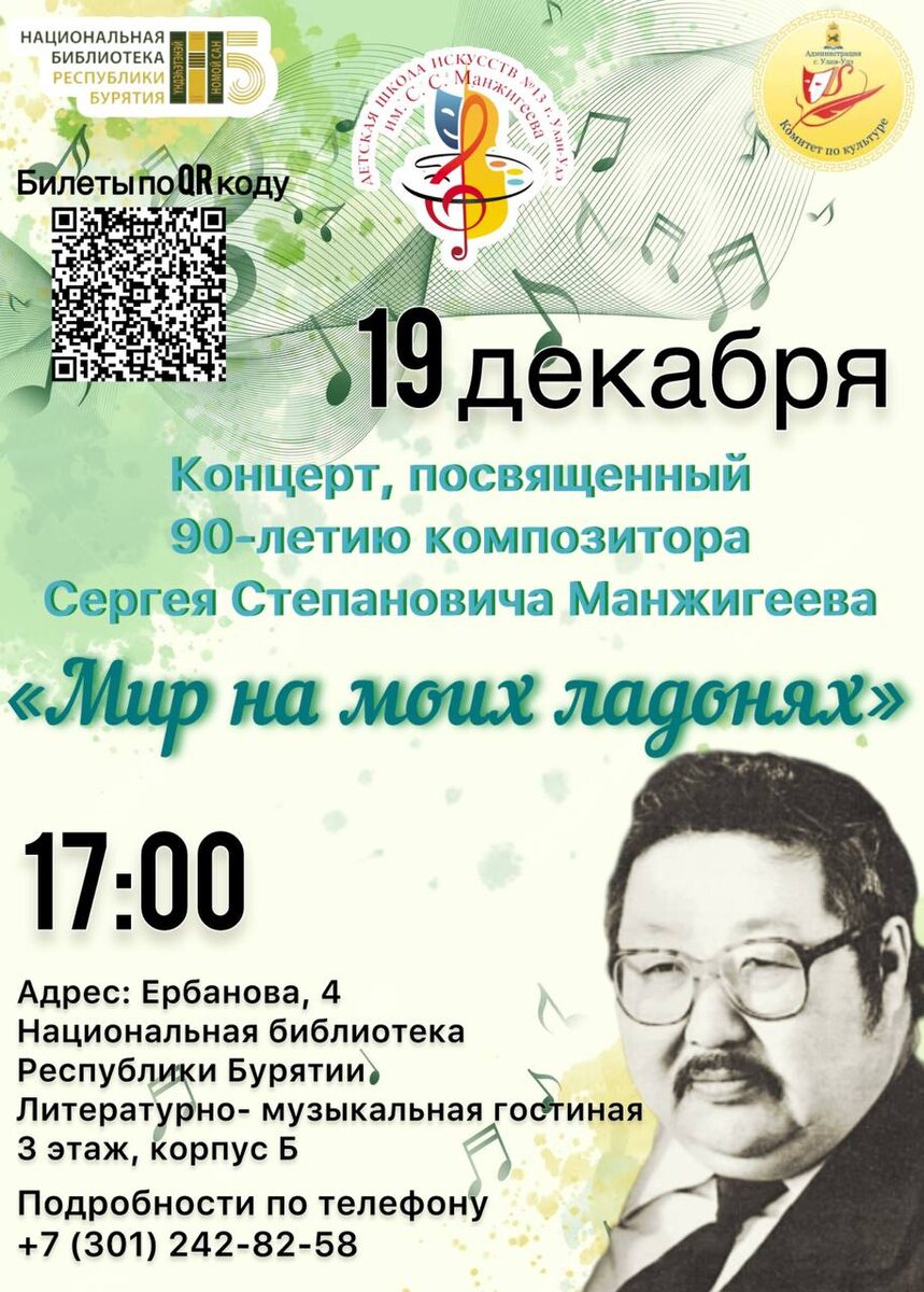 ✨🎶 Приглашаем на концерт памяти Сергея Степановича Манжигеева! 🎶✨ В этом году мы отмечаем 90-летие со дня рождения выдающегося бурятского композитора Сергея Степановича Манжигеева. Его музыкальное наследие – это сокровищница мелодий, воспевающих красоту родного края, самобытность бурятской культуры и глубокие чувства, понятные каждому сердцу. Сергей Степанович создал множество прекрасных произведений на бурятском и русском языках, писал вдохновляющую музыку на стихи бурятских поэтов. Наша Детская школа искусств 13 им. С. С. Манжигеева, завершает юбилейный год композитора большим концертом, посвященным его памяти. В этот вечер прозвучат самые любимые и известные произведения Сергея Степановича в исполнении наших талантливых учеников и преподавателей. 🗓️ Дата: 19 декабря ⏰ Время: 17:00 📍 Место: Ербанова 4, «Национальная библиотека Республики Бурятия», литературно-музыкальная гостиная, 3 этаж, корпус Б. Билеты по ссылке ⤵️ https://iframeab-pre7119.intickets.ru/seance/68676369