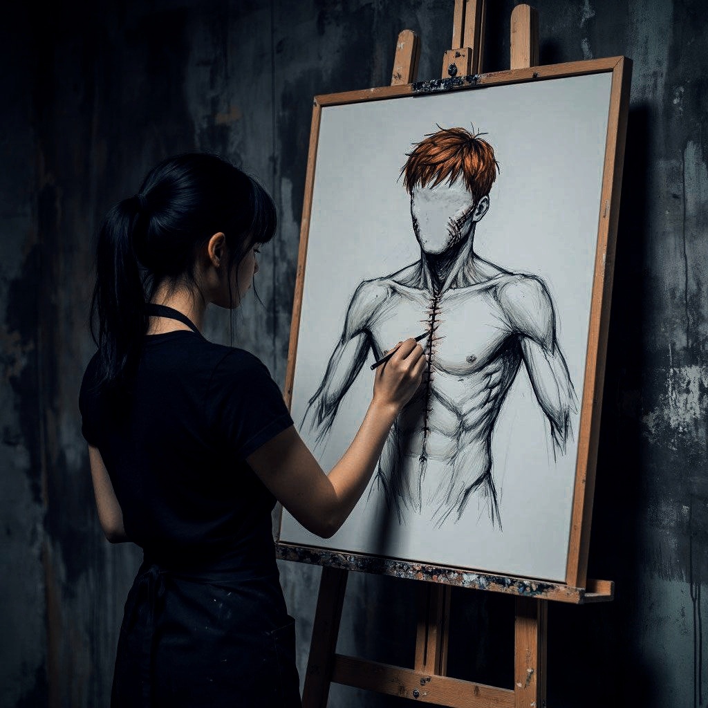 Она указала на мольберт. На холсте была изображена сцена, недавно пережитая Владленом. Там был он, в мельчайших подробностях, только без лица.