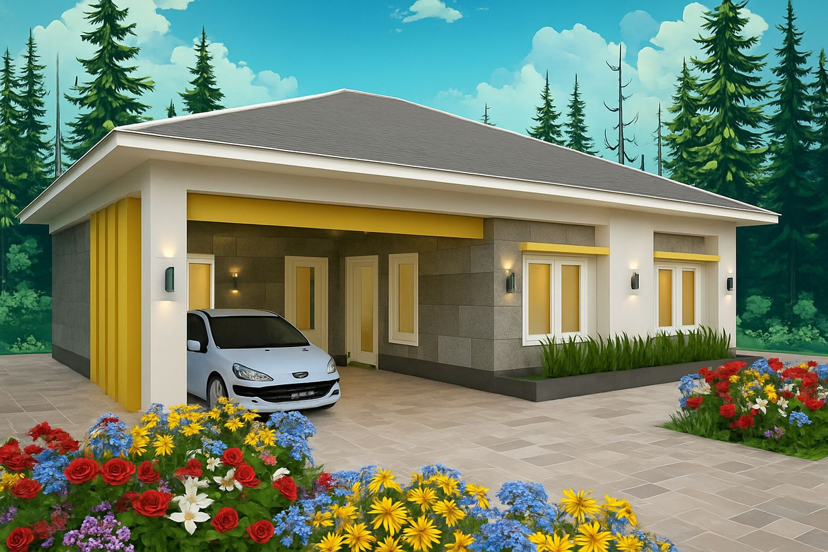 По вопросу о том, где лучше содержать автомобиль на загородном участке – в гараже или под специальным навесом, существуют различные мнения. Но даже при наличии гаража на загородном участке полезно дополнительно иметь автонавес для ежедневного пользования автомобилем. Одним из возможных решений может быть строительство автонавеса в комплексе с загородным домом под одной крышей. Такой вариант имеет одно важное преимущество – возможность защищенной от осадков посадки-высадки непосредственно перед входом в дом. Примером такого подхода может служить проект одноэтажного коттеджа, в котором предусмотрена крытая парковка под общей четырехскатной вальмовой крышей. В доме имеются следующие помещения: прихожая, три спальни, кухня-гостиная открытой планировки, два санузла, котельная-постирочная и веранда. Выход на веранду из кухни-гостиной осуществляется через раздвижные стеклянные двери. Из крытой парковки можно пройти в прихожую дома. Кроме того, предусмотрен выход на парковку из кухни-гостин