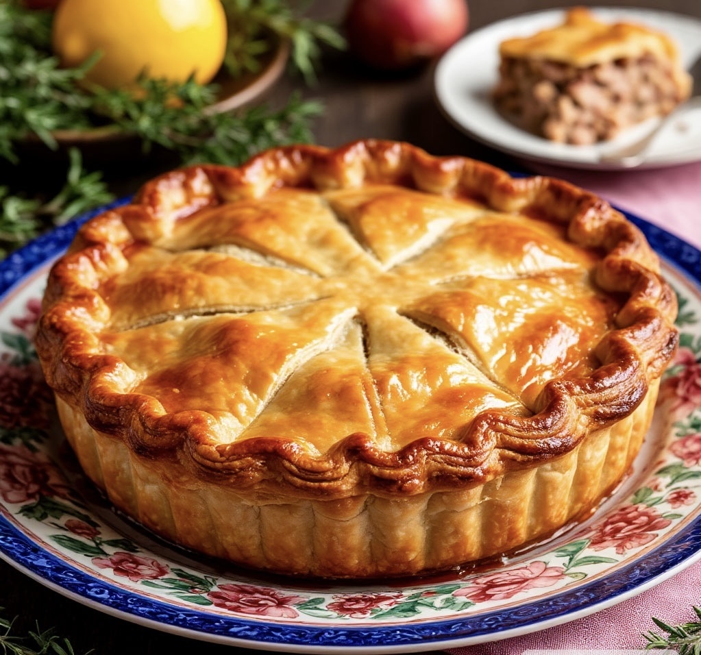 Мечтаете о тёплом, уютном блюде для семейного застолья? Этот пирог с сочной начинкой из индейки и сезонных овощей и хрустящим слоёным тестом станет настоящим хитом. Готовится просто, а результат впечатляет: ароматное мясо, нежные овощи и золотистая корочка. Ингредиенты Для теста: мука — 2,5 чашки (375 г); соль — 1 ч. л. (7 г); масло сливочное (холодное) — 1 чашка (200 г); вода ледяная — 6–8 ст. л. (90–120 мл). Для начинки: индейка (готовая, нарезанная) — 350 г; лук репчатый — 1 шт. (крупная); сельдерей — 2 стебля; морковь — 2 шт. (средние); картофель — 2 шт. (средние); горошек (свежий или замороженный) — 1 чашка (150 г); масло сливочное — 2 ст. л. (30 г); мука — 2 ст. л. (30 г); бульон куриный — 1 чашка (250 мл); соль — по вкусу; перец чёрный молотый — по вкусу; яйцо (для смазывания) — 1 шт. Пошаговый рецепт Шаг 1. Приготовление теста В большой миске смешайте муку и соль. Холодное сливочное масло нарежьте кубиками (1×1 см) и добавьте к муке. Быстро перетрите смесь руками или вилкой до