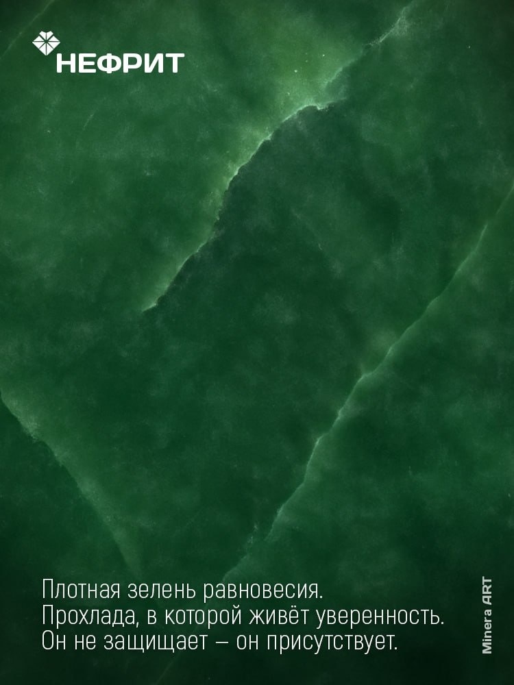 Нефрит — плотный, тёплый, с мягкой, чуть маслянистой поверхностью. Он не стремится к блеску, не требует внимания. Оттенок — зелёный, равномерный или с лёгкой глубиной. Когда держишь его — не возникает желания отпустить. В нём есть устойчивость, не в словах, а в ощущении. Он как вещь, которая просто есть. И на неё можно опереться. Он не просит быть понятым. Но помогает не рассыпаться. ___________ Minera ART — направление, в котором мы пробуем почувствовать каждый минерал — и делимся результатом в своей группе.