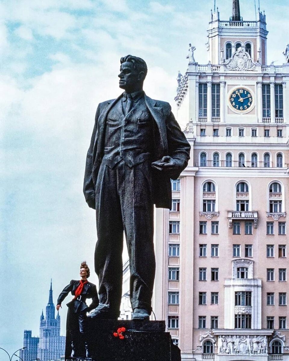 Mugler в СССР. Футуризм среди бетонных гигантов В конце 80-х Тьерри Мюглер привёз свою моду в Советский Союз. Его героини шли по пустым проспектам и суровым фасадам так, будто прибыли с другой планеты. Советская архитектура для Мюглера стала не декорацией, а партнёром по драме: бетон, монументальность и холодная геометрия идеально усилили его визуальную фантастику. СССР получил дозу модного sci-fi (от англ. Science fiction — научная фантастика) на фоне панелек и мемориалов. Съёмка стала культовым доказательством: если у бренда сильная эстетика, он может превратить даже постсоветский бетон в подиум. И да, эти кадры сегодня выглядят круче, чем в 1989. @lookahead by Look Ahead 🍉