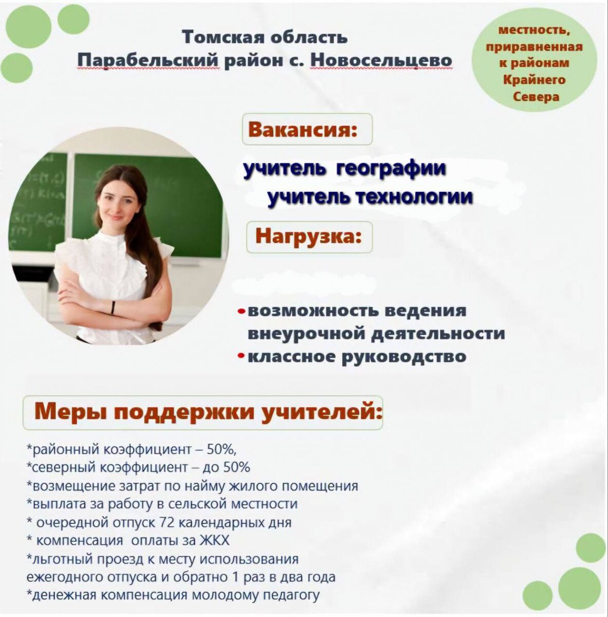 Уважаемые жители Парабельского района! Школе в селе Новосельцево требуется учитель географии (временно) и учитель технологии (у мальчиков). Если вы или кто-то из ваших знакомых готов присоединиться к педагогической команде Новосельцевской средней школы, звоните: 📞 8-952-679-28-18 Елена Сергеевна (директор школы). 📍Поделитесь этим объявлением. Возможно, именно ваш репост поможет найти нужного человека!