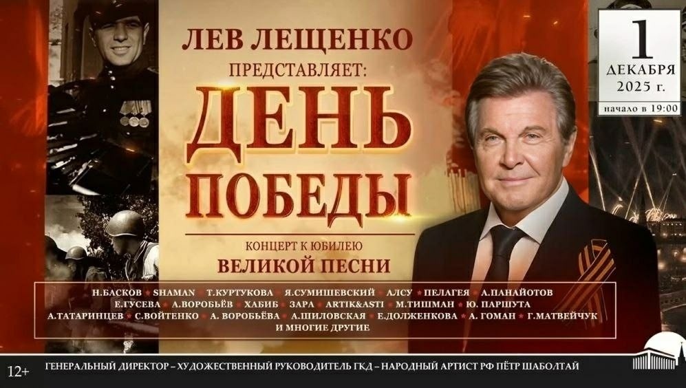 1 декабря 2025 года в Государственном Кремлёвском дворце состоялся грандиозный концерт, посвящённый 50-летию легендарной песни «День Победы». Автором и идейным вдохновителем программы стал народный артист РСФСР Лев Лещенко – несравненный исполнитель этого знакового произведения. Концепция программы представляет собой масштабное театрализованное действие, где каждая сцена выстроена с особой драматургической точностью. Зрители погружаются в атмосферу мирного времени, светлого неба и радости, которая сменяется трагическими событиями войны. Через весь военный период, тему освобождения и великой Победы проходит мощный реквием «Поклонимся великим тем годам» в сопровождении симфонического оркестра и детского хора. В программу вошли 27 знаковых композиций — от «Священной войны» до «Дня Победы». Особое внимание, по словам Льва Валерьяновича Лещенко уделялось подбору исполнителей, преимущественно молодых артистов, способных продолжить эстафету памяти. К сожалению, лично посетить грандиозный к