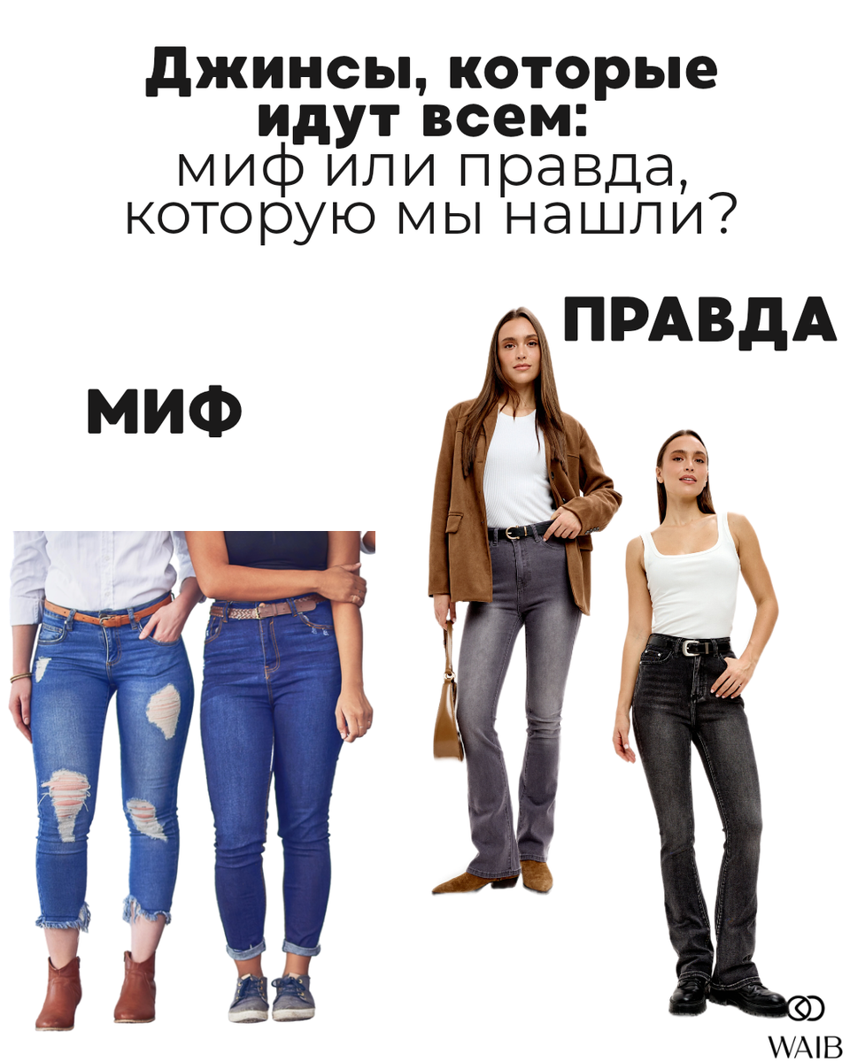 Каждая из нас хотя бы раз в жизни стояла перед стеной джинсов в магазине с мыслью: «Почему на манекене — идеально, а на мне сидит странно?». Производители любят заявлять об «универсальных моделях», но так ли это? Мы в WAIB решили разобраться, существует ли на самом деле священный Грааль денима — джинсы, которые будут лестны и комфортны для разных типов фигур. И кажется, мы нашли ответ. Глава 1: Почему большинство джинсов — не «для всех» Давайте честно: тело каждой женщины уникально. Разное соотношение талии, бедер, длина ног, полнота икры — все это делает поиск идеальной пары квестом. Часто «универсальность» — это просто маркетинг. Например: Узкие скинни могут идеально облегать одну фигуру, но на другой создадут нежелательные складки или будут давить. Прямые классические часто «теряют» талию на фигуре типа «прямоугольник». Широкие клеши от бедра могут визуально укорачивать невысоких девушек. Секрет не в одной волшебной модели, а в правильно подобранном крое, деталях и пропорциях.