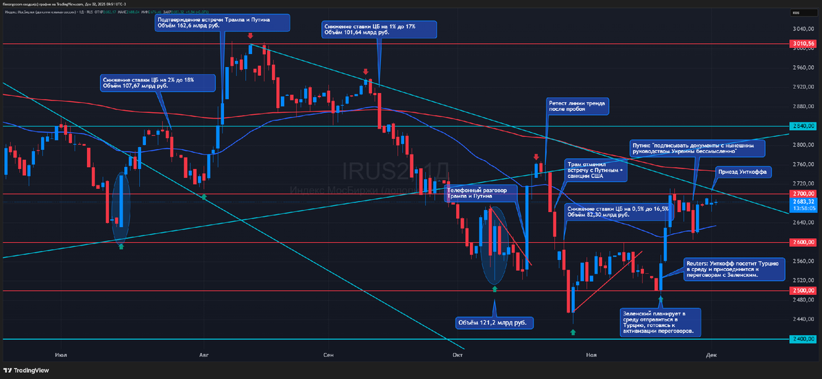 Сегодня очень волатильный день! Во-первых все ждут приезда Уиткоффа в Москву, встреча пройдёт во второй половине дня. Может быть много покупок, продаж, новостных вбросов. Ликвидность скорее всего будет низкая, поэтому будут задёрги, как вчера (откройте 5-минутный график индекс МосБиржи и посмотрите на него с 11 до 15 по мск). Кроме этого, будет инвестиционный форум «Россия зовет!», на котором выступают глава Банка России Эльвира Набиуллина, министр финансов Антон Силуанов, министр экономического развития Максим Решетников. Их комментарии создадут дополнительную волатильность. Также, будет выступление президента после 16 часов по мск. Всё остальное сегодня не важно. Более того, мы как раз подошли к ключевому уровню сопротивлению 2700 пунктов и нисходящей линии тренда с дневного графика. Если встреча не даст результата, то с такой ликвидностью быстро можем вернуться на 2500-2600 пунктов по индексу МосБиржи. Если текущий приезд Уиткоффа приведет к возможной встречи в Будапеште, то пробье
