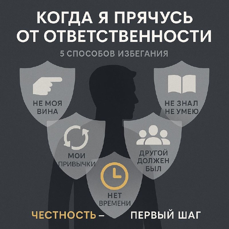 КОГДА Я ПРЯЧУСЬ ОТ ОТВЕТСТВЕННОСТИ 🎭 Вчера говорил: декабрь — месяц ответственности. Красиво звучит, правда? Но сегодня — вторник. День честности. И давай честно: я сам часто прячусь от ответственности. Не всегда. Не везде. Но прячусь. И знаю, что ты тоже. Поэтому сегодня — про то, как мы избегаем ответственности. Без приукрашивания. Честно. 1. "ЭТО НЕ МОЯ ВИНА" Первый способ — винить. Обстоятельства. Людей. Систему. Рынок. Экономику. Клиентов. Команду. "Я бы справился, но..." Но это прятаться. Потому что если не моя вина — значит, не моя ответственность. Удобно. Безопасно. И разрушительно. 2. "Я НЕ ЗНАЛ" / "Я НЕ УМЕЮ" Второй способ — прятаться за незнание. "Я не знал, что так будет." "Я не умею это делать." Но вот правда: Не знал — узнай. Не умеешь — научись. Иначе это не объяснение. Это отговорка. И за этим часто стоят когнитивные ограничения. Установки: "Я не могу", "Это не для меня", "Я такой, какой есть". Но если ты предприниматель — твоя работа расти. 3. "КТО-ТО ДР