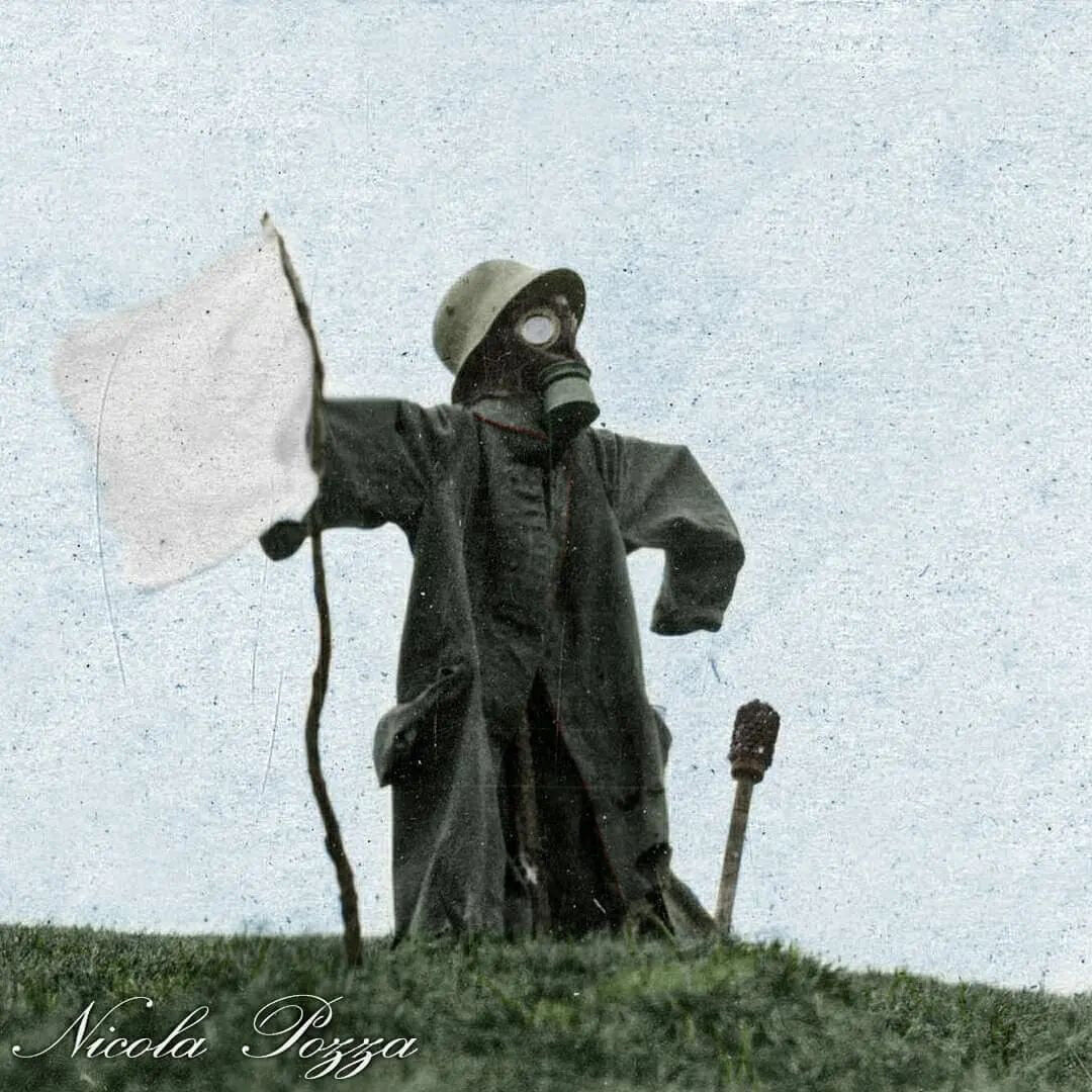 Пугало в немецкой форме сдается в плен после окончания Первой Мировой, Виртон, Бельгия, 2 декабря 1918 года.