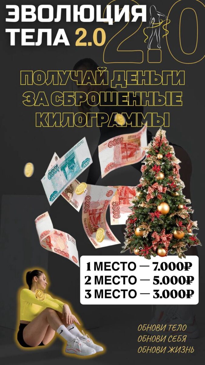 💰ПОЛУЧАЙ ДЕНЬГИ ЗА СБРОШЕННЫЕ КИЛОГРАММЫ На марафоне «ЭВОЛЮЦИЯ ТЕЛА 2.0», который стартует 10 ДЕКАБРЯ у вас будет шанс выиграть НОВОГОДНИЙ денежный приз за ваш результат 🤩 БУДЕТ 3 ПРИЗОВЫХ МЕСТА ☄️ 🏆 🍎МЕСТО — 7.000₽ 🎄 🏆 🍎МЕСТО — 5.000₽ 🎄 🏆 🍎МЕСТО — 3.000₽ 🎄 Не важно, какой у тебя начальный вес, учитывать будем процент сброшенного веса 👌 Поэтому шанс на победу есть у каждой из вас 🔥🔥🔥 А результат я гарантирую 100% всем 🤩
