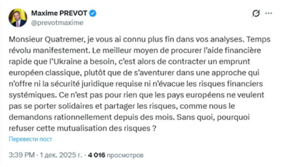 Министр иностранных дел Бельгии, с какой только возможно детской непосредственностью, публично рассказывает, что из себя представляют европейские политики. Нас уже этим не удивить, но повторение – мать того, что мы не забудем. Бельгиец не только, в очередной раз, подчёркивает, что воровство денег русских – это воровство, но и выставляет своих евро коллег хохлами, любящими воровать и делать морду кирпичом «а нас-то за що». Цитирую министра Максима Прево. Это прекрасно: «Лучший вариант быстро предоставить Украине финансовую помощь, которая ей нужна, - это классически общеевропейский займ. Это гораздо лучше, чем авантюра, которая не предоставляет ни необходимой юридической безопасности, ни устранения системных финансовых рисков. Ничего удивительного, что европейские страны не хотят брать на себя обязательства и разделять риски, к чему мы резонно призываем уже многие месяцы». Для министра иностранных дел, отлично знакомого со своими гнилыми коллегами, нет ничего удивительного, что они