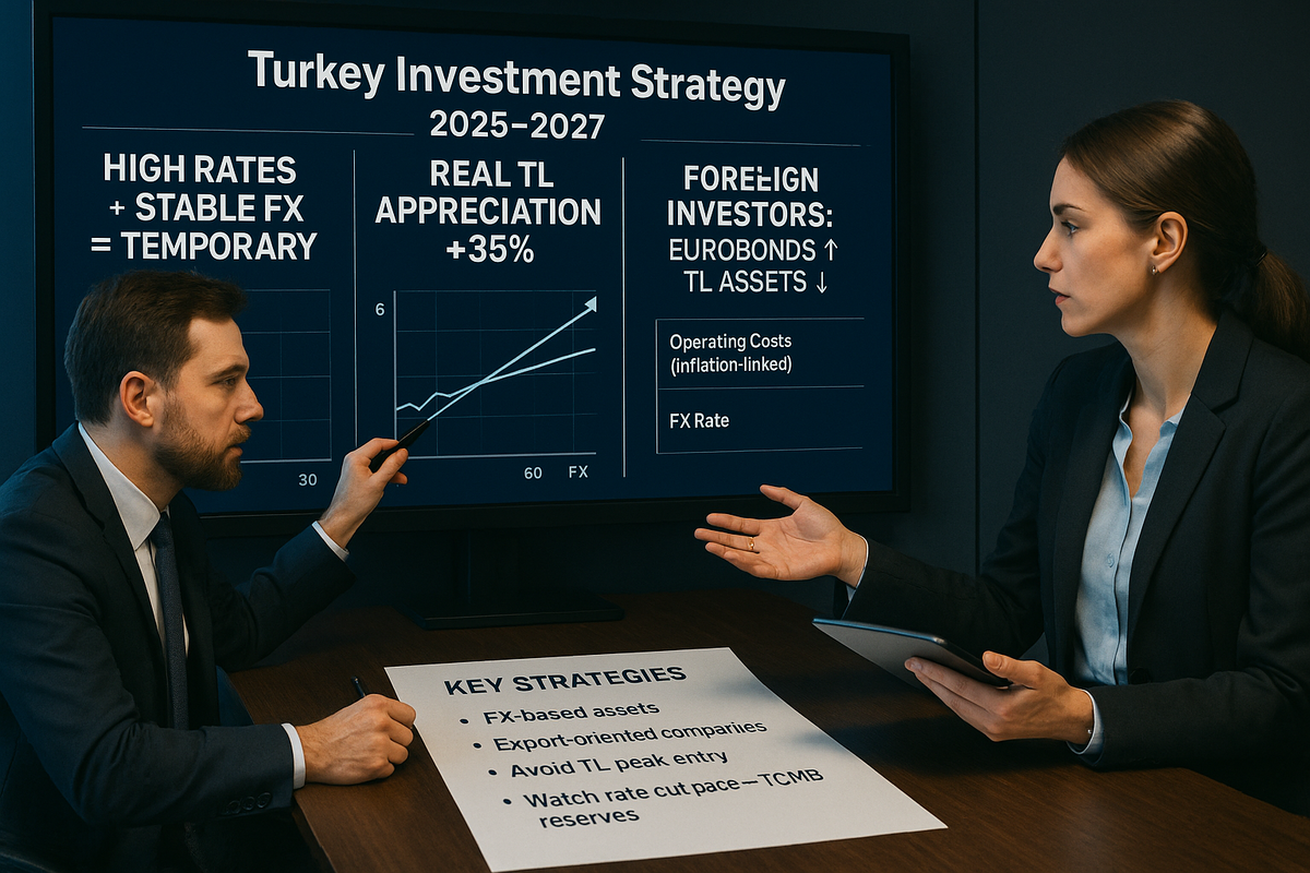 Для инвестора (портфельного или прямого) важны не академические нюансы, а практические последствия. В Турции эти последствия формируют реальный профиль риска всех вложений — от облигаций до производственных проектов. Турция одновременно удерживает высокий процент и стабильный курс - это временная конструкция Если страна не вводит жёсткий контроль капитала, невозможно одновременно управлять: • высокой процентной ставкой (сдерживание инфляции, защита TL), • и медленным ростом валютного курса (контроль импорта, защита от шока). Практический вывод для инвестора: ➡️ Текущая комбинация ставок и стабильного курса неустойчива во времени. ➡️ Ожидается корректировка по одному из параметров - либо курс ускорится, либо ставки будут снижены быстрее. Это означает неопределённость горизонтов и ценового уровня инвестиционного входа. Реальная ревальвация TL создаёт риск переоценки активов TL в реальном выражении укрепилась более чем на 35% с июля 2023 года. Это делает страну дороже в долларовом выраж