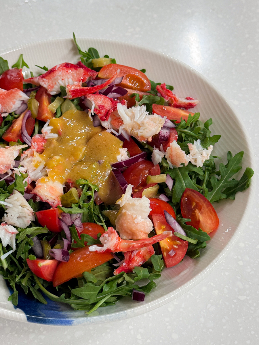 Этот салат — идеальный баланс нежного сладковатого мяса краба, пикантных овощей и яркой заправки. Готовится за 10 минут, а впечатляет как ресторанное блюдо! Ингредиенты: Мясо камчатского краба Руккола Красный лук Черри томаты Малосольные огурчики Для заправки: оливковое масло, 1 ч.л. горчицы, сок половины лимона, соль, свежемолотый перец. Приготовление: Подготовка. Если у вас краб в панцире — аккуратно извлеките мясо. Готовое мясо краба нарежьте крупными кусочками. Красный лук нашинкуйте тонкими полукольцами, черри разрежьте пополам, огурчики нарежьте небольшими кубиками. Заправка. Взбейте вилкой оливковое масло, горчицу и лимонный сок до состояния эмульсии. Приправьте солью и перцем по вкусу. РСборка. На широкое блюдо или тарелку выложите подушку из рукколы. Сверху разложите крабовое мясо и все нарезанные овощи. Полейте приготовленной заправкой прямо перед подачей. Приятного аппетита! Кушайте вкусно с Рыба моя❤️ Если вы ищете надежного поставщика для своего бизнеса, переходите на н