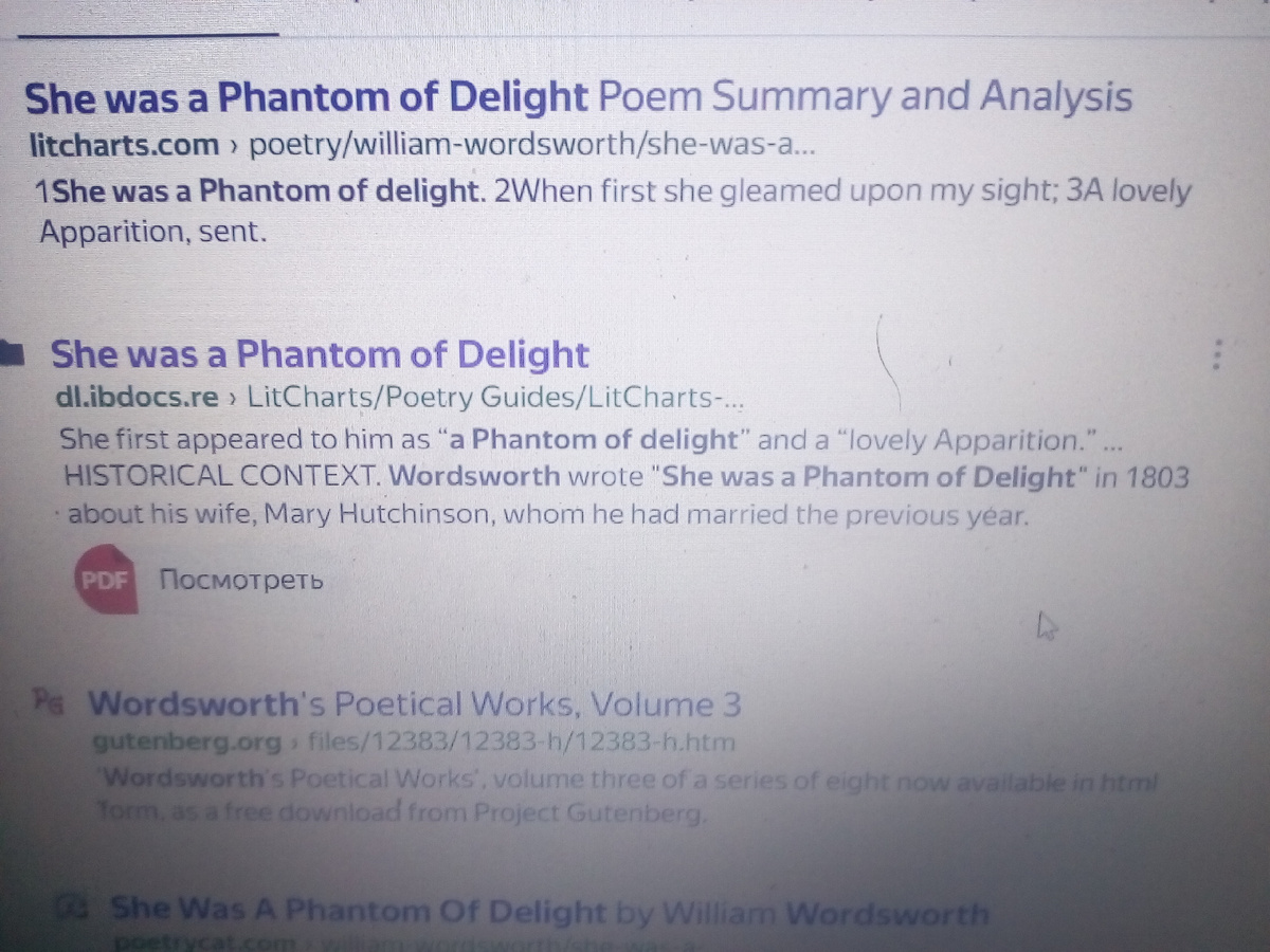 Уильям Вордсворт. (Перевод в прозе). Вариант 1. Она была призраком неземного восторга, Когда впервые мелькнула перед моим взором; Прекрасное Видение, посланное судьбой, Чтобы стать украшением на мгновение; Её глаза - как звёзды прекрасных сумерек; Как у сумерек, её тёмные волосы; Но всё остальное в ней было взято Из мая и весёлого рассвета; Танцующая богиня, весёлая Афродита, Манящая, восхитительная и коварная. Я увидел её при ближайшем рассмотрении, Душа, но и Женщина! Она грациозна, легка и свободна, В её шагах - невинная красота; Лицо, в котором встречались Сладкие укоры, столь же сладкие обещания; Существо не слишком удобное или хорошее Для ежедневной жизни человека; Часто не вынести её печалей, хитрых уловок, Хвалы, порицания, любви, поцелуев, слёз и улыбок. И теперь я вижу ясным взором Сам пульс жизни милой женщины, Дышащей задумчивым дыханием Путешественницы между жизнью и смертью; Но её разум тверд, её воля сильна, В ней - выносливость, предвидение, сила и мастерство; Совершенная Женщина, благородно задуманная, Чтобы согревать, утешать и повелевать; И всё же душа у неё подвижная и яркая С каким-то ангельским светом. * * *