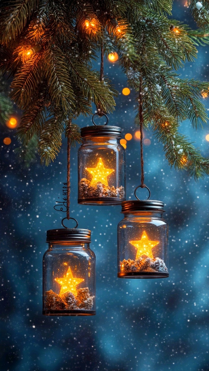 · Снежные банки: Насыпьте в высокую прозрачную банку соль, сахар или искусственный снег. Установите внутрь свечу-таблетку. Украсьте банку снаружи веточкой и бечёвкой.