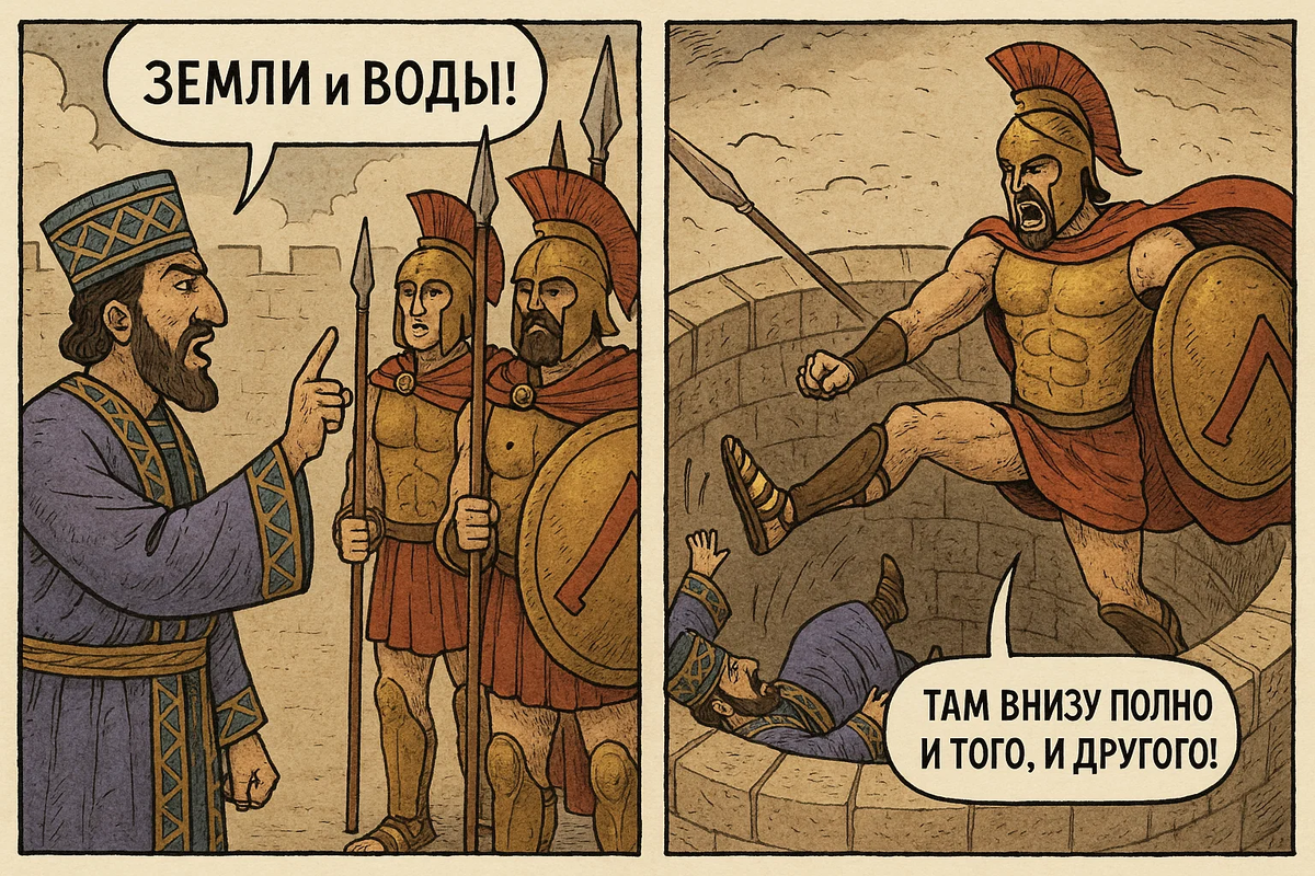 Персидские послы: "Земли и воды!" — "А не пойти ли вам..." В начале V века до н.э. персидский царь Дарий I решил, что Греция — отличная новая территория для его коллекции. Он разослал послов с требованием: "Земли и воды" (то есть полного подчинения).