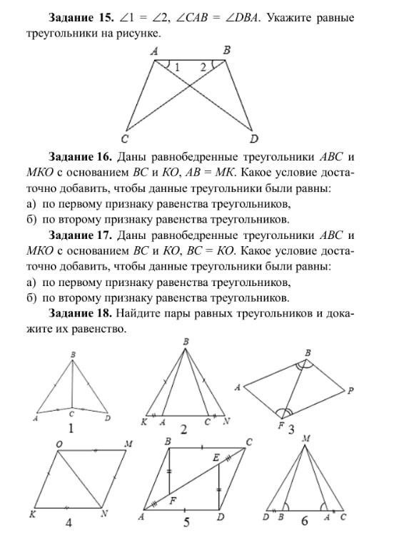 Продолжаем помогать родителям, которые следят за школьной успеваемостью ребёнка. 7 класс. Геометрия Полностью практическая неделя. Треугольники и все о них. Основные понятия и свойства Определение треугольника: Треугольником называется фигура, состоящая из трех точек (вершин), соединенных отрезками (сторонами). Виды треугольников: По сторонам: равнобедренный, равносторонний, разносторонний. По углам: остроугольный, прямоугольный, тупоугольный. Основные элементы треугольника: Стороны. Углы. Высоты, биссектрисы, медианы. Сумма внутренних углов равна 180 градусов. Внешний угол равен сумме двух внутренних углов, не смежных с ним. Признаки равенства треугольников Первый признак равенства треугольников: Если две стороны и угол между ними одного треугольника соответственно равны двум сторонам и углу между ними другого, то треугольники равны. Второй признак равенства треугольников: Если одна сторона и два прилежащих к ней угла одного треугольника соответственно равны стороне и двум прилежащим