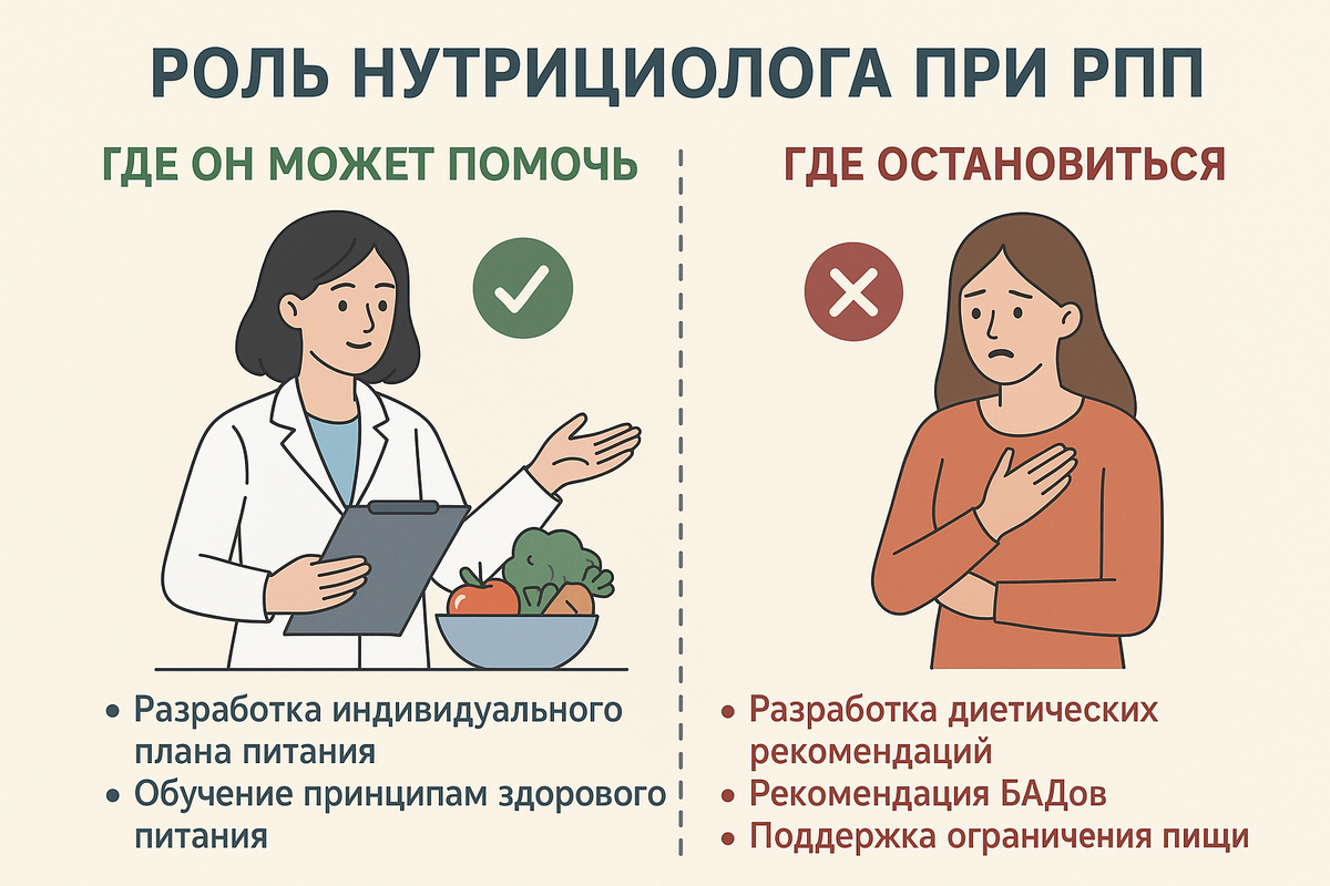 Он знает, по каким признакам можно заподозрить РПП, и мягко, но уверенно советует клиенту обратиться к психиатру или психотерапевту. Это его главная и самая важная задача. Помогает наладить режим питания