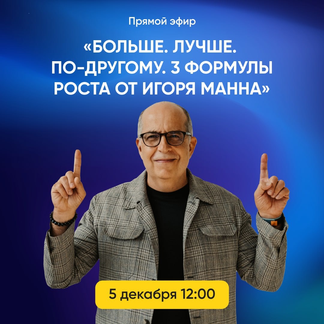 Готовы к самой честной и работающей бизнес-математике? 5 декабря в 12:00 проведу прямой эфир «Больше. Лучше. По-другому. 3 формулы роста от Игоря Манна» Расскажу историю слогана, который стал формулой роста. Поделюсь тремя способами, как применить её к своему бизнесу. Дам мини-задания, которые помогут вам сразу начать действовать... ...а на мастер-классе — инструменты, как превращать эти принципы в рост и деньги. А где именно будет эфир? Это пока секрет, но скоро раскроем 😉 Не пропустите — будет вдохновляюще и практично! Do more, do better, do different