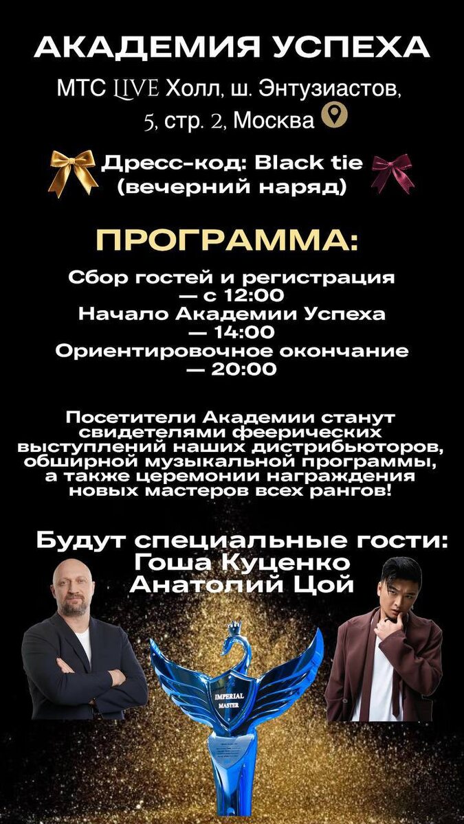 **Академия Успеха в Москве!** 6 декабря 2025 года 😍Рады пригласить вас на масштабную Академию Успеха, которая состоится 6 декабря 2025 года в Москве! Это одно из самых ожидаемых событий года, посвящённое участникам❤️ 💞- Сбор гостей и регистрация — с 12:00 💞Начало Академии Успеха — 14:00 💞Ориентировочное окончание — 20:00 ⭐️Посетители Академии станут свидетелями феерических выступлений наших дистрибьюторов, обширной музыкальной программы, а также церемонии награждения новых мастеров всех рангов! ❗️А также вас ждут специальные гости: - Гоша Куценко - Анатолий Цой В конце мероприятия всех ждет зажигательная дискотека!🪩 Дресс-код: Black tie (вечерний наряд)