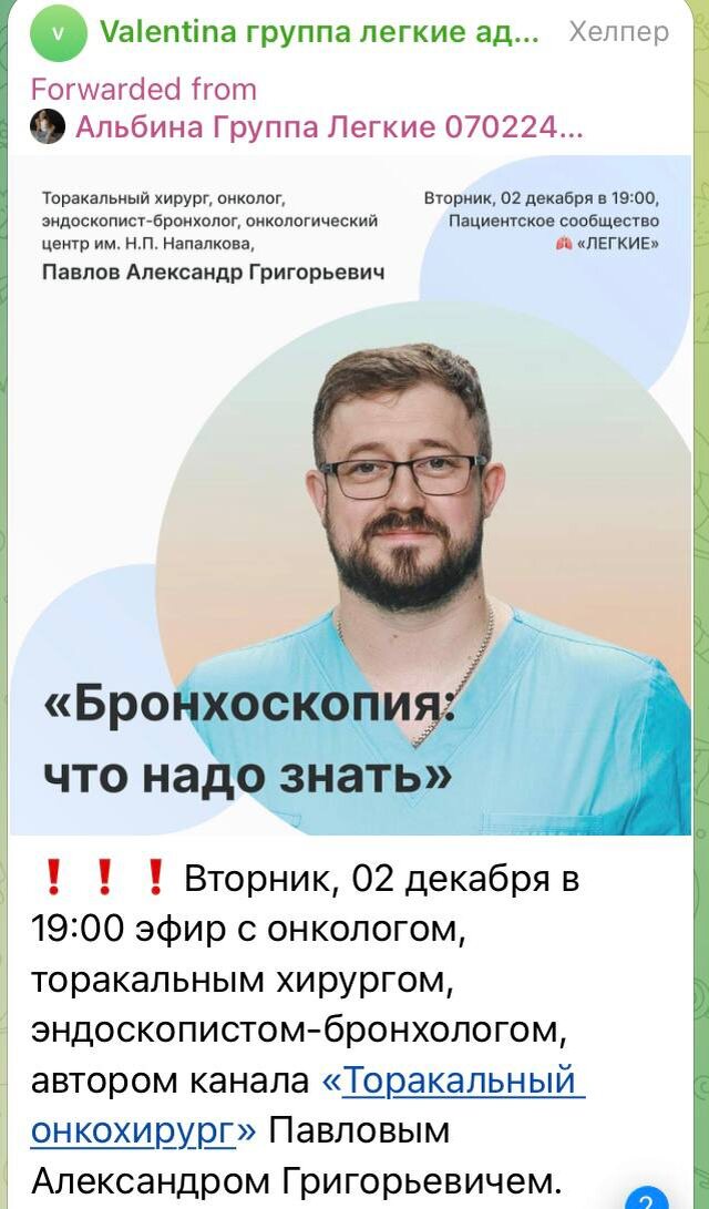 ‼️СЕГОДНЯ в 19:00 эфир с онкологом‼️ ❗️❗️❗️Вторник, 02 декабря в 19:00 эфир с онкологом, торакальным хирургом, эндоскопистом-бронхологом, автором канала «Торакальный онкохирург» Павловым Александром Григорьевичем. Оставить свой вопрос на тему эфира можно в нашем закрытом чате. Ссылка на трансляцию будет выложена позже. #раклегкого, #раклегких, #пациентскаягруппалегкие, #хирургия, #лечение Ссылка на эфир https://us06web.zoom.us/j/86412403654?pwd=EQ8aKzxZDWxvXYteIt31KOmG8ZmbNM.1