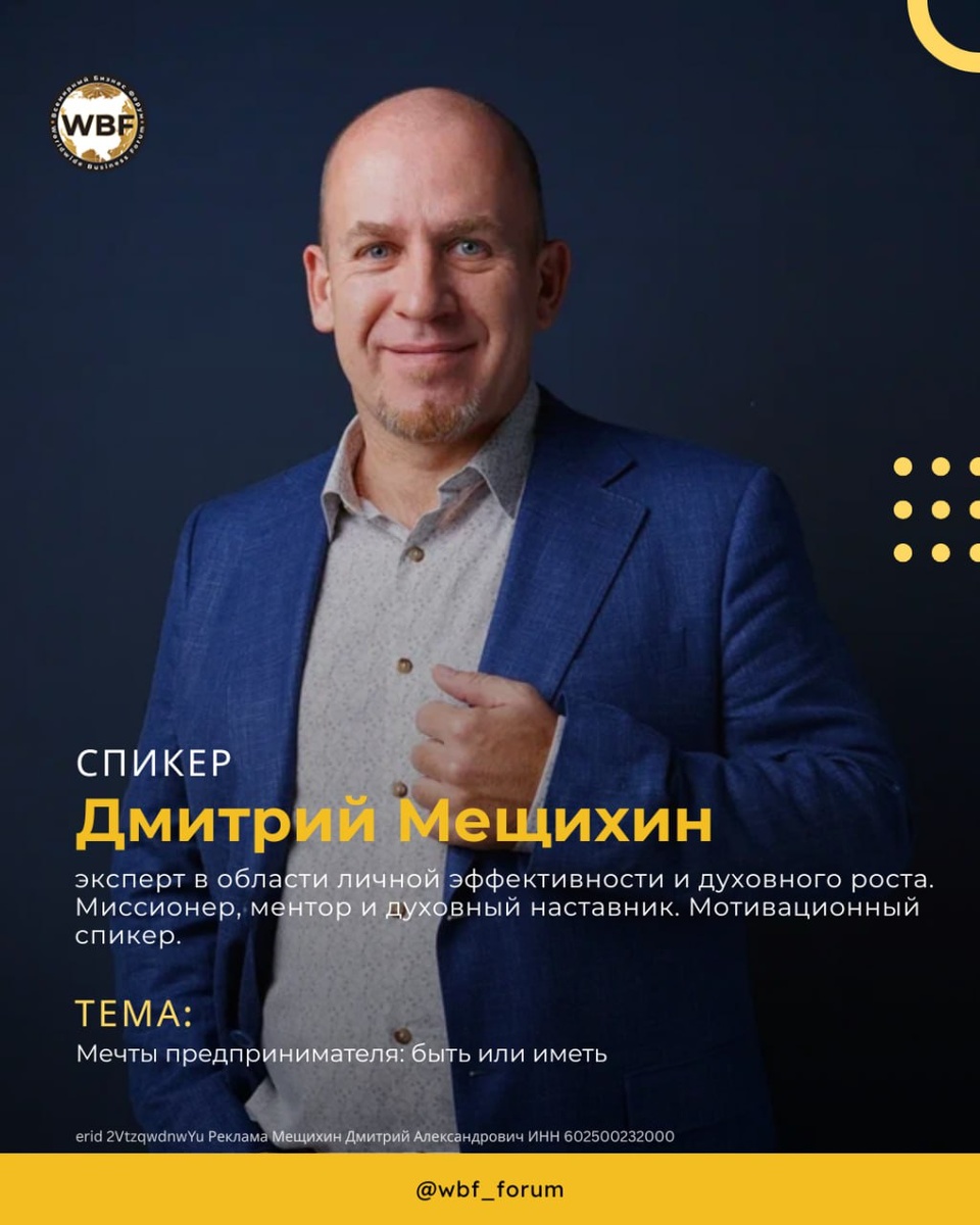 СПИКЕР ВСЕМИРНОГО БИЗНЕС ФОРУМА 🎙ДМИТРИЙ МЕЩИХИН - Эксперт в области личной эффективности и духовного роста; миссионер, ментор и духовный наставник; мотивационный спикер; автор и основатель бренда "Мечта не ошиблась"; соавтор книги "Жизнь без фильтров" вместе с Ником Вуйчичем, Джоном Максвеллом, Андреасом Тиссеном и другими авторами; автор готовящейся к изданию книги "Я. Инструкция по применению"; член Ассоциации спикеров СНГ CISSA при участии Радислава Гандапаса; член международной ассоциации спикеров ISA; автор трансформационных тренингов и методик квантового изменения мышления; более 20 лет опыта в сфере личного консультирования. ➡️ ТЕМА: Мечты предпринимателя: быть или иметь ➡️ Контакты VK публичная страница: https://vk.com/dreammystory VK личная страница: https://vk.com/dm60rus YouTube: https://www.youtube.com/@d_my_story Телеграм канал: https://t.me/can_you_dream ************* 🎙МИХАИЛ СОРОКИН - Четыре образования – экономическое, два психологических и психотерапевтическое. А