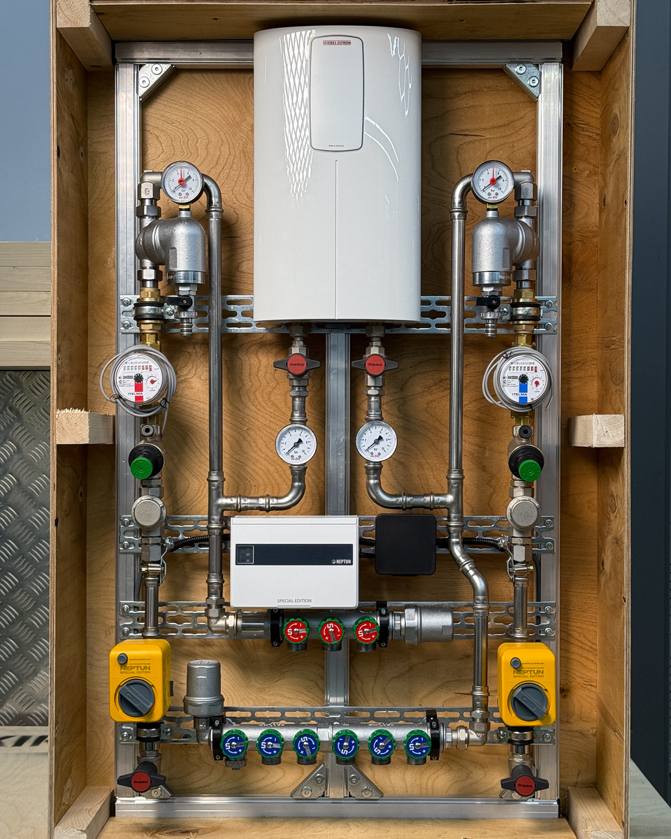 Этот узел собран вокруг системы Neptun Smart — одной из самых современных защит от протечек на рынке. Особенность блока управления заключается в том, что он работает даже при отключенном электричестве, благодаря встроенным аккумуляторам. Это решает сразу несколько критических проблем.