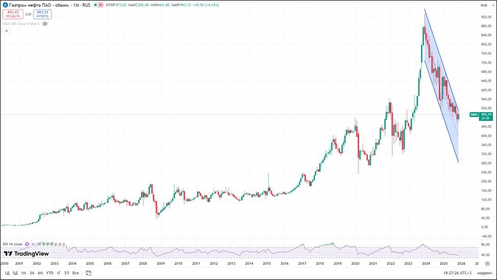 Газпром нефть. 3 квартал 2025: что важно знать инвестору ➖О компании Газпром нефть — одна из крупнейших ВИНК России с добычей свыше 100 млн т н.э. в год и глубокой переработкой на ключевых НПЗ в Омске, Москве, Ярославле и Сербии. Запасы компании обеспечивают работу более чем на 20 лет. Контроль полностью у Газпрома, фрифлоат — меньше 5%, поэтому бумаги не входят в индекс Мосбиржи. С 2022 года компания под санкциями ЕС, а с 2025 — под блокирующими санкциями США. ➖Акции Котировки уже два года в нисходящем тренде и упали почти вдвое от исторических максимумов. С начала 2025 года снижение около 22%. Давят слабая финансовая динамика, дешёвая нефть в рублях, крепкий курс и рост долга из-за прежних крупных дивидендов. ➖Операционные результаты В 3 кв 2025 добыча выросла на 3% г/г, переработка осталась на уровне прошлого года. Последние кварталы операционная активность почти не растёт. По итогам девяти месяцев прирост умеренный: добыча +4%, переработка +3%. Существенных драйверов тут пока не