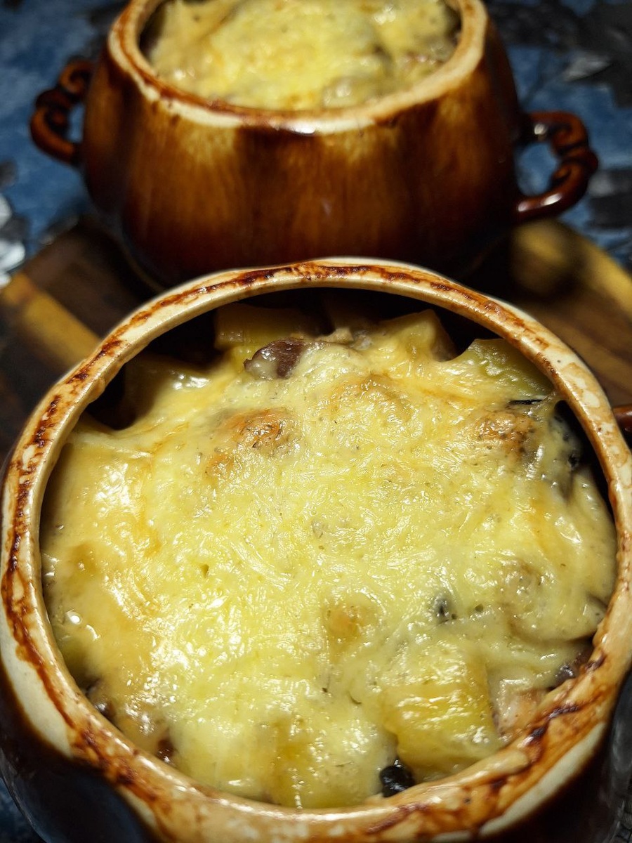 Грибы нарезать произвольно и обжарить на раст. масле до исчезновения жидкости. Добавить лук , нарезанный кубиком и жарить до готовности. Мясо нарезать небольшими кубиками, добавить кубиком картофель, грибы с луком, сметану и воду, все хорошо перемешать, солим и перчим по вкусу. Раскладываем в горшочки ( 2 шт. ), накрываем крышечками и выпекаем в духовке 50 - 60 минут при 190 гр.. Достаем горшочки, снимаем крышечки, посыпаем тертым сыром и продолжаем запекать до румяного цвета сыра. Приятного аппетита!