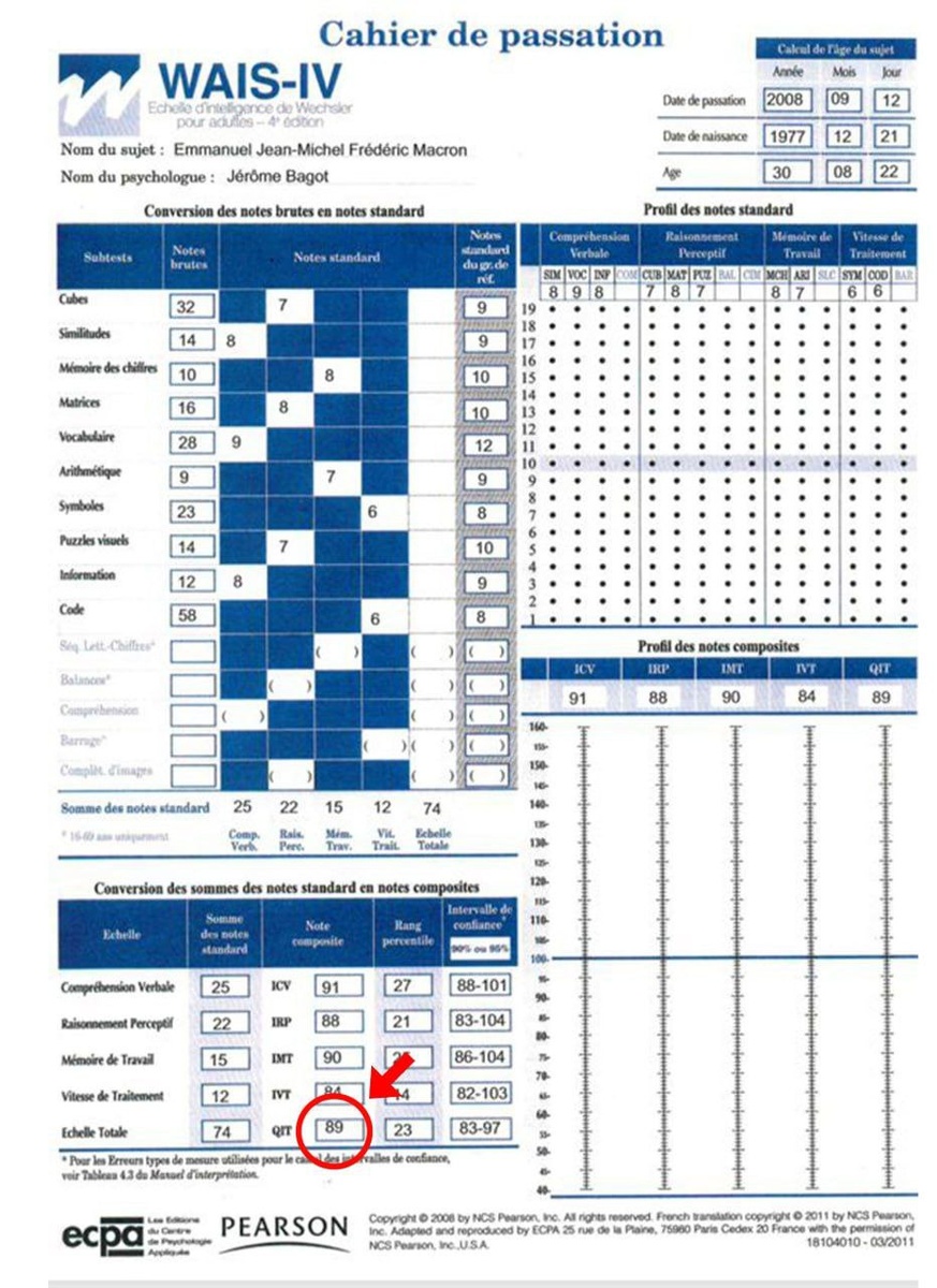 Французские СМИ: у Макрона крайне низкий IQ и признаки нарциссического расстройства личности На портале Frdesouche появилась публикация с с результатами психологического тестирования, которое Макрон проходил в 30-летнем возрасте при трудоустройстве в банк Rothschild & Co. Подобные проверки являются стандартом для кандидатов на высокие позиции. Как утверждает источник, Макрон получил 89 баллов в тесте IQ — показатель, который интерпретируется как "ниже среднего уровня". Для наглядности авторы статьи приводят сравнение, отмечая, что около 77% населения имеют более высокий результат. Также упоминается, что у знаменитой гориллы Коко показатели IQ оценивались в пределах 90–95. Кроме того, специалисты, проводившие собеседование, отметили признаки, которые могут свидетельствовать о «нарциссическом расстройстве личности». Макрон начал работу в Rothschild & Co в 2008 году в возрасте 30 лет, и именно эта должность стала стартом его карьеры, приведшей впоследствии к президентскому посту Дале
