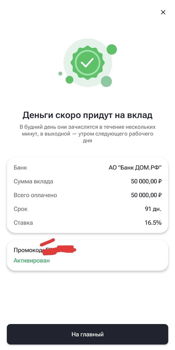 Открыл очередной вклад для "оборотки". Раз в 3 месяца у меня закрываются вклады на 50-100т.р. так мне легче оплачивать кредитки. Использовал промокод из магазина Финуслуг. Кстати если примените мой промокод при открытии первого вклада, сможете получить До 4000р Промокод: RFRMD6LEM До 18:00 сегодня можно открыть вклад под 16,5% на 3 месяца🙏