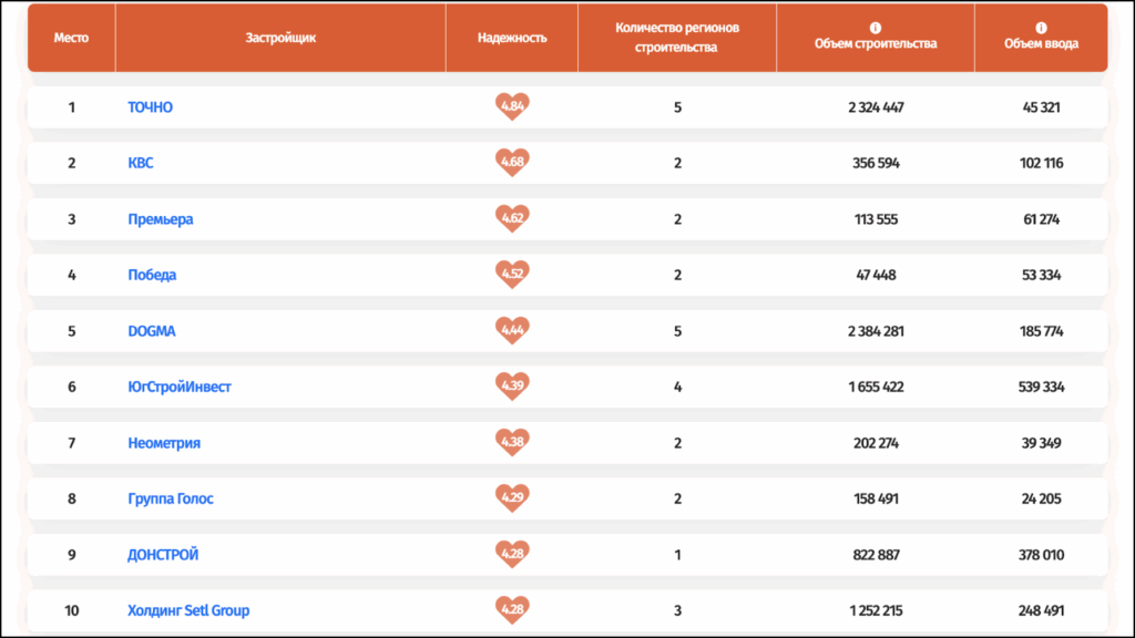 Он базируется на реальных оценках и отзывах тысяч покупателей квартир, которые уже живут в новых районах или только планируют важное приобретение. Девелопер ГК ТОЧНО, компании «КВС» и «Премьера» возглавили рейтинг надежности застройщиков России по итогам ноября 2025 года, составленный порталом Всеостройке.рф. В основе рейтинга — оценки проектов застройщиков, которые ежемесячно тысячи пользователей оставляют в отзывах на платформах Яндекс, 2GIS и непосредственно портале Всеостройке.рф. Это жители, покупатели, потенциальные клиенты, гости жилых проектов и просто неравнодушные люди. Они делятся своим опытом, оценивая качество построенного жилья, своевременность сдачи объекта, работу управляющей компании, и рассказывают об общем впечатлении от сотрудничества с застройщиком или конкретного проекта — строящегося либо уже сданного. Эти оценки агрегируются в средний балл, который обновляется каждый день в 8:00 по московскому времени, обеспечивая актуальность данных. По итогам ноября 2025 года