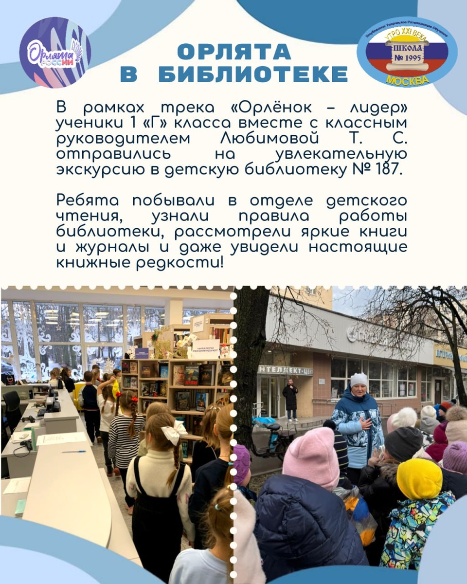 Орлята в библиотеке! 📖 Ученики 1 «Г» класса под руководством Любимовой Т. С. побывали на увлекательной экскурсии в библиотеке № 187 в рамках трека «Орлёнок – лидер». 📖 Ребята познакомились с устройством библиотеки, увидели редкую дореволюционную книгу 1903 года, полистали книжки-миниатюры и стали участниками небольшого спектакля. 📚 Путешествие подарило первоклассникам новые знания и яркие эмоции — отличное начало дружбы с миром чтения! ВКонтакте | Сайт | Max #ДОНМ #ШколыКолледжиМосквы #школа1995