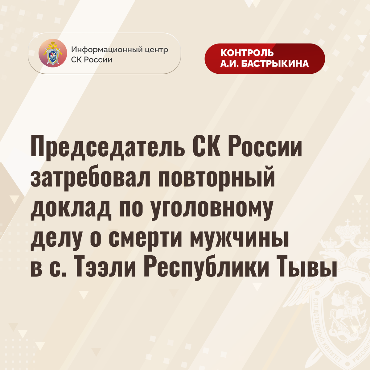 Председатель СК России затребовал повторный доклад по уголовному делу о смерти мужчины в с. Тээли Республики Тывы В Информационный центр СК России поступило обращение по вопросу несогласия с ходом установления обстоятельств смерти мужчины в селе Тээли Республики Тывы. В июле текущего года он вместе со знакомыми направился на рыбалку к реке Алаш, после чего перестал выходить на связь и по месту жительства не вернулся. Спустя две недели его тело было обнаружено в русле реки с телесными повреждениями. По мнению заявителя, смерть его брата может носить криминальный характер. До настоящего времени никто к ответственности не привлечен. Указанная ситуация ранее освещалась в социальных сетях. А.И. Бастрыкин ставил ее на контроль в центральном аппарате ведомства. В СУ СК России по Республике Тыве расследуется уголовное дело. Председатель Следственного комитета Российской Федерации Александр Иванович Бастрыкин затребовал у руководителя СУ СК России по Республике Тыве Константина Владимировича
