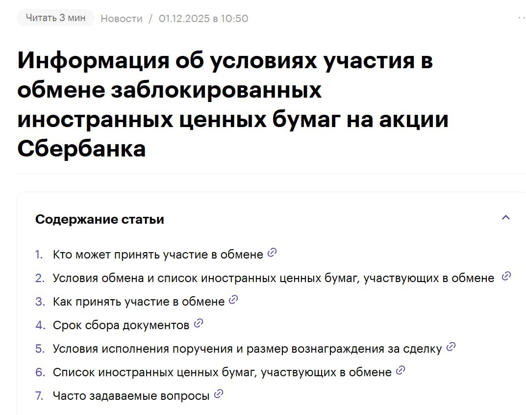 В БКС меняют заблокированные иностранные акции на Сбер. https://bcs-express.ru/article-hidden/121e570b-702b-476f-9cac-5b4797738043 Принять участие в обмене могут клиенты — физические лица, являющиеся резидентами РФ, которые держали иностранные ценные бумаги, участвующие в обмене, в ООО «Компания БКС» по состоянию на 17 ноября 2022 г. и владели ими на 2 июня 2022 г. Клиенты с ИИС также могут принять участие в обмене. __________ ✅ Вадим Григорьев Деньги•Жизнь•Психология