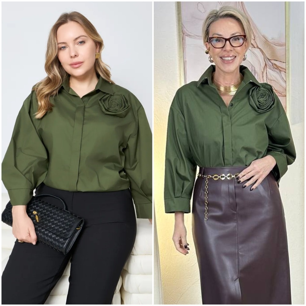 Здравствуйте, дорогие читатели! Меня зовут Ирина, я - стилист, и на этом канале показываю одежду и аксессуары с Wildberries такими, как они есть, то есть, из серии "ожидание/реальность". Мои параметры: рост 169 см, вес 67 кг, 94-74-100 ✅Основной канал: Стильно - не значит дорого! Ставьте лайк в поддержку канала, и давайте смотреть на мою сегодняшнюю покупку. Рубашка Состав: 35% хлопок; 65% полиэстер Размеры: 44-54 Цена: 2473 руб Рубашка цвета хаки с цветком: свободный крой и деликатный акцент Тёплый, приглушённый оттенок зелёного напоминает о позднем лете и спокойной осени. Модель оверсайз скроена так, чтобы не облегать фигуру, а мягко её окутывать, создавая ощущение лёгкости и непринуждённости. Застёжка на пуговицах и классический воротник сохраняют вид строгой рубашки, но свободный силуэт сразу сдвигает восприятие в сторону современного casual. Изюминка модели — деликатный цветок в области плеча. Он не броский, но заметный, превращает базовую вещь в предмет с характером. Цветок выпо