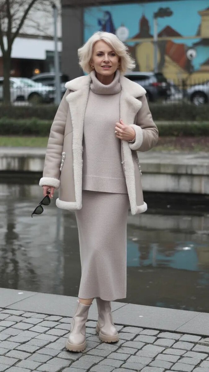 1. Светло-бежевый минималистичный комплект, составленный из прямой юбки-миди и свободного джемпера с высоким горлом, будет выглядеть еще более элегантно, если надеть поверх него лаконичную дубленку и удобные ботинки «челси» на толстой подошве. Образ можно отнести и к повседневным, и к деловым, в зависимости от того, какой стиль жизни ближе для примерившей его стильной даме.