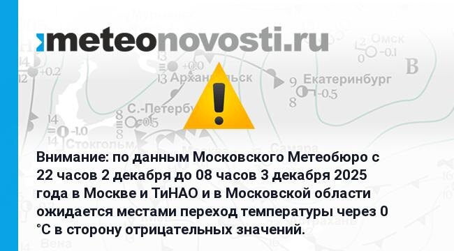 Внимание: по данным Московского Метеобюро c 22 часов 2 декабря до 08 часов 3 декабря 2025 года в Москве и ТиНАО и в Московской области ожидается местами переход температуры через 0 °C в сторону отрицательных значений. Перейти на сайт Прогноз погоды на 14 дней