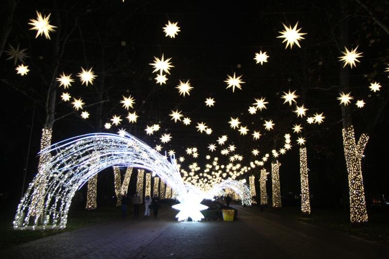 В центре Кубанской столицы заработала иллюминация, переданная в 2024 году городу меценатом Сергеем Галицким. Во всем своем великолепии, как и планировалось, иллюминация зажглась вечером 1 декабря, несмотря на моросящий дождь и прохладную погоду. Сотни краснодарцев вышли на Александровский бульвар, чтобы увидеть, как центральная улица кубанской столицы превратилась в сплошной световой коридор. Как и в прошлом сезоне 2024–2025 годов, световые конструкции растянулись от улицы Будённого до улицы Гаврилова, над бульваром вновь зажглись светящиеся звезды в районе кинотеатра «Аврора», а проход к Александровской триумфальной арке оформили декоративными арками и праздничной подсветкой деревьев. А оформление рядом с гостиницей "Интурист" напоминает фильм «Аватар». Год назад инсталляция Галицкого стала одним из главных зимних символов Краснодара: на улицу Красную специально приезжали туристы из соседних регионов, а горожане отмечали, что в вечерние часы по улице было не протолкнуться из‑за желающ