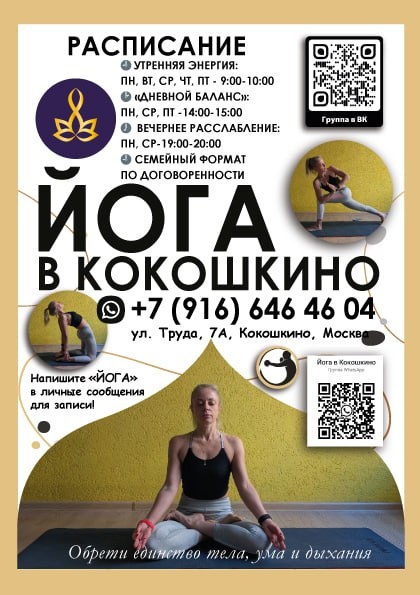 Практика, которая дарит телу здоровье, а душе — покой Привет! Меня зовут Ольга. Практикую йогу с 2009 года. Я обучалась у лучших учителей в Индии и в России Мой путь в йоге — это история про глубокое восстановление. Трижды я возвращала своему телу силу, гибкость и баланс после родов. И этот опыт научил меня главному: йога — это искусство заботы о себе, доступное каждому. Это не просто занятия. Это возможность: 🌸Снять стресс, избавиться от тревожности. 🌸 Обрести подтянутое, послушное и гибкое тело. 🌸 Найти внутреннюю опору и душевное равновесие. 🌸 Дарить себе свободу движений и легкость. Приглашаю вас на бесплатную открытую практику 7 декабря в 17:00, Новая Москва, м.Кокошкино, ул.Труда 7А, спортивный клуб "Бруклин" Это 1,5 часа, чтобы познакомиться, почувствовать дыхание и мягко раскрыть тело. Оплата — donation. Что принести с собой: Удобную одежду, воду, полотенце. Коврик есть в зале, но свой — всегда комфортнее. Если в сердце отзывается — напишите мне в любом мессенджере «