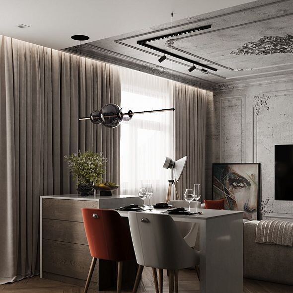 Современный дизайн квартиры: сочетание лепных декоров с фактурой бетона