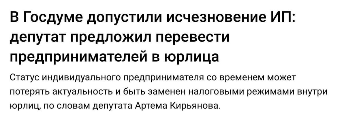 ⚡️ИП под угрозой? В Госдуме обсуждают отмену статуса! Зампред комитета по экономической политике Артём Кирьянов заявил, что формат индивидуального предпринимательства может уйти в прошлое. Причина? Его якобы часто используют в серых схемах, а контроль за ИП недостаточно прозрачен. ❗️ Пока это не законопроект, а только обсуждение. Но сигнал тревожный: ФНС и Минэкономразвития молчат, а крупные игроки начинают готовиться к возможным изменениям. 📌 Что делать предпринимателям уже сейчас? ▪️ Следить за новостями (мы публикуем только важное) ▪️ Оценить риски и подумать о переходе на другие формы ▪️ Подписаться на наш канал — тут вы узнаете о последствиях и возможных вариантах действий первыми 👉 @CPS_Channel — будь в курсе важных изменений