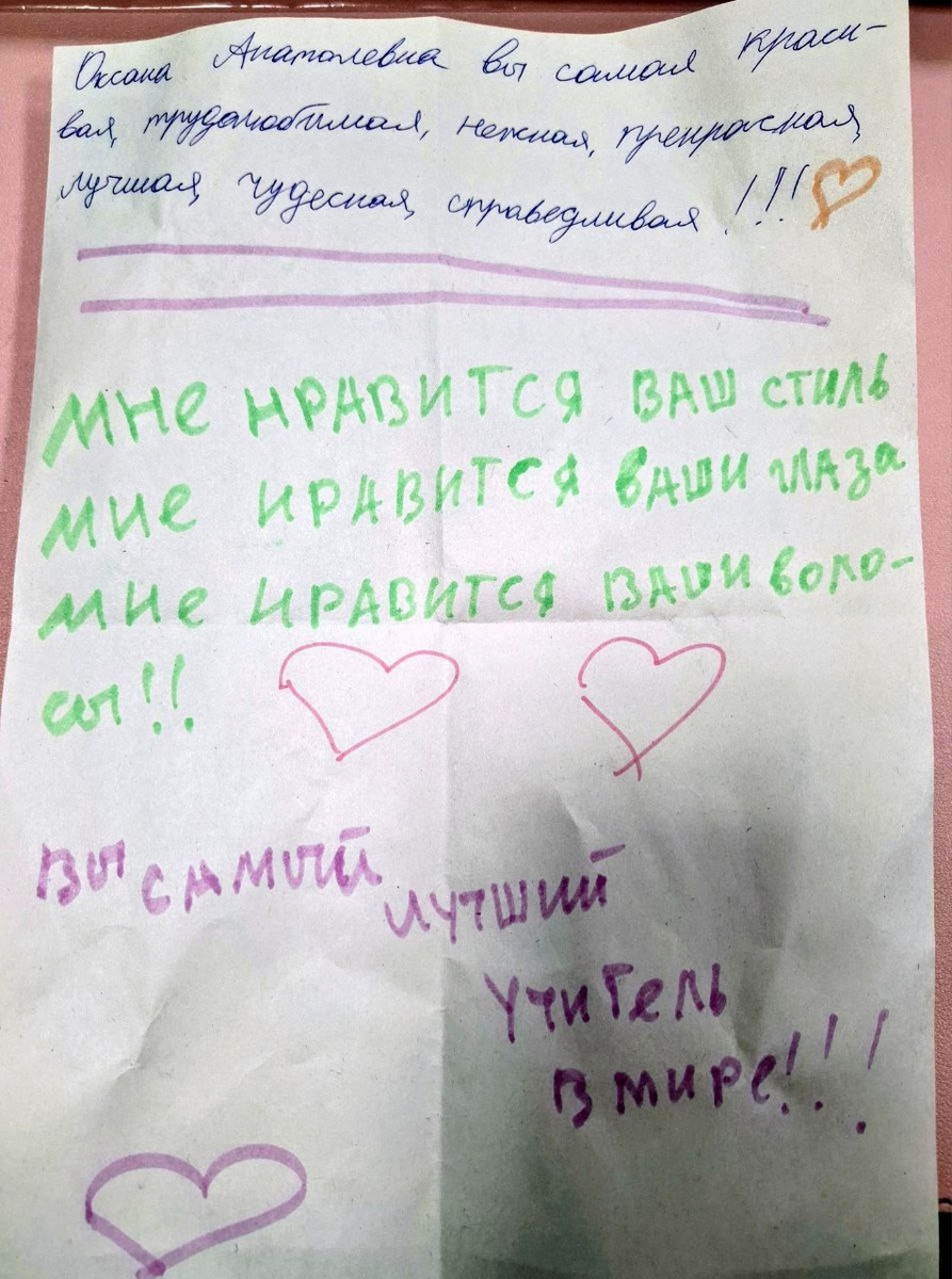 Привет 👋 Знаете, есть у меня одна любимая фраза, которую я часто повторяю: чтобы жизнь была замечательной, ее нужно научиться замечать. И это правда, ведь вся прелесть – в мелочах: в мимолетном моменте, в искренней улыбке, в добром слове, которое согревает. Последний месяц выдался для меня, честно говоря, чертовски непростым. Было много всего, и сил оставалось совсем мало. И вот сегодня, перед уроком, на моем столе записка. Кто-то из учеников оставил. (Вряд ли это кто-то из учителей😂😂) И знаете что? Она меня так улыбнула! В самый нужный момент. Решила поделиться этим маленьким чудом и с вами🤗