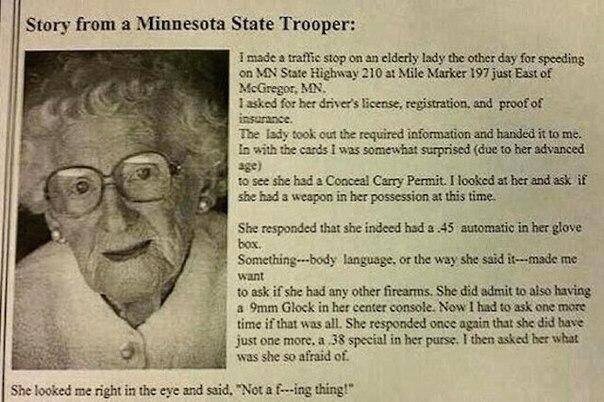 История от дорожного полицейского из Миннесоты. Как-то раз я остановил пожилую даму за превышение скорости на трассе 210, на 197-й миле, сразу к востоку от города МакГрегор, Миннесота. Попросил предъявить права, регистрацию и страховку. Дама передала мне документы. Я был несколько удивлён (учитывая её солидный возраст), обнаружив среди документов лицензию на скрытое ношение оружия, и спросил, вооружена ли она в данный момент. Дама ответила: да, у неё пистолет калибра .45 в бардачке. Что-то заставило меня спросить, а нет ли у неё ещё оружия, кроме упомянутого. Она сказала: да, у неё в центральной консоли ещё лежит 9-мм «Глок». И тут я догадался спросить: «И это всё?». Нет, сказала она, ещё есть .38 в сумочке. Тогда я спросил, чего она так боится. Дама пристально посмотрела на меня и сказала: «Да ни хрена я не боюсь!»