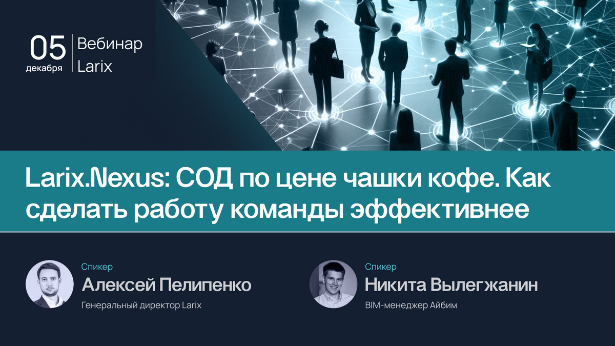 Согласования и поиск актуальной версии отнимает у команды много времени при работе с документами и моделями. Узнайте, как система СОД (среда общих данных) может решить эту проблему. Регистрация по ссылке. 📆 5 декабря в 11:00 (МСК) на вебинаре мы: Расскажем, что такое СОД, и кому она нужна Поговорим про новый функционал в Larix.Nexus, который вы ждали: Модуль согласований Ролевая модель Публичные ссылки ☕ Причем тут чашка кофе? Всего 50 000 ₽/год за 10 пользователей ~417 ₽/чел./мес, дешевле подписки на стриминговый сервис или чашки кофе в Москве. При этом — enterprise-функционал, локализация, поддержка и обновления без доплат. Участникам — бонус: чек-лист "5 шагов к внедрению среды общих данных без боли" Спикеры: Алексей Пелипенко, генеральный директор Larix Никита Вылегжанин, BIM-менеджер Айбим Участие бесплатное. Регистрация по ссылке