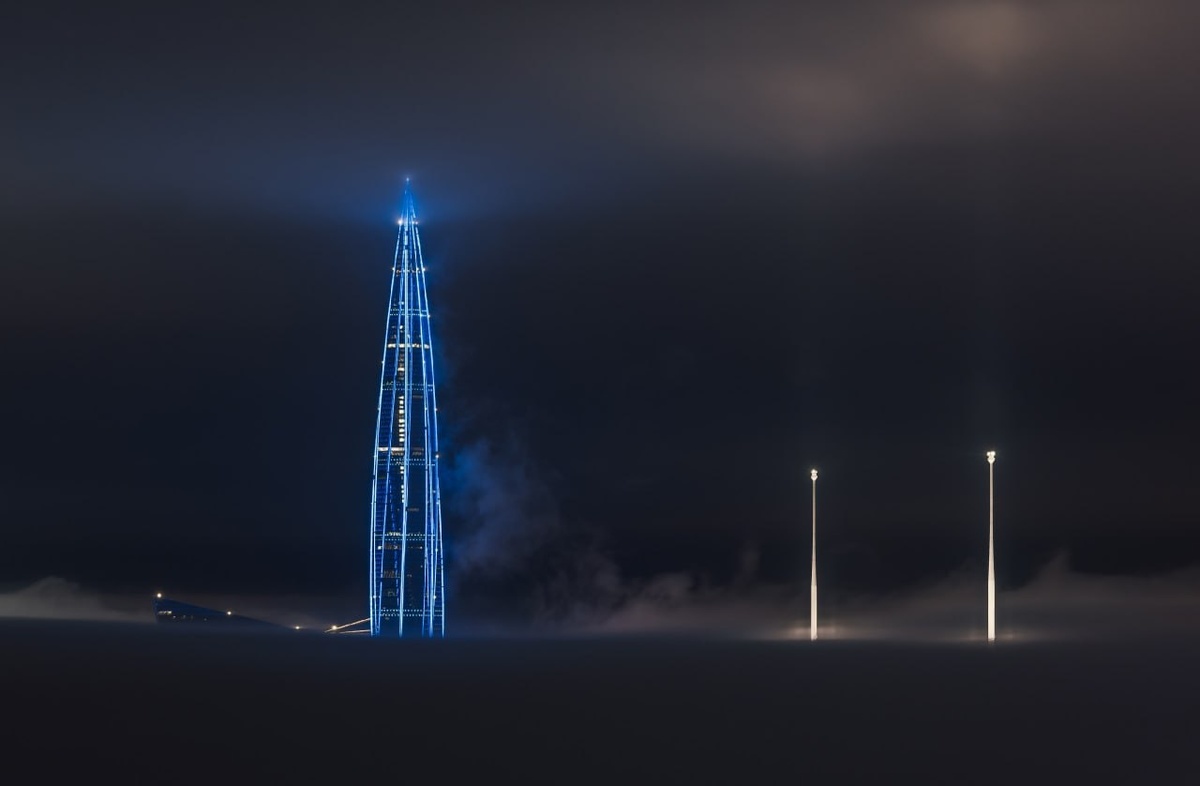 На снимках запечатлён небоскрёб «Лахта Центр» в традиционной подсветке выходного дня (на буднях используется белое свечение