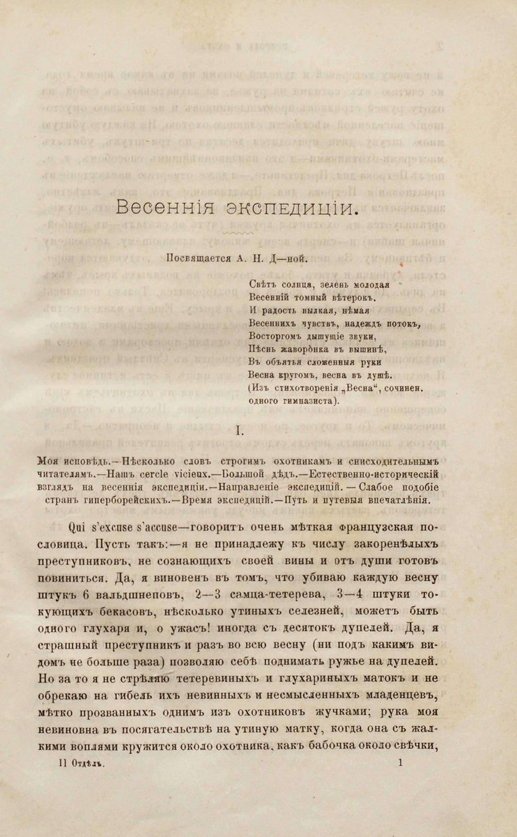 «Вот туда бы, где весна всесильная, могучая, развертывается в полной красе, где настоящая её родина — на далёкий север! Ну-с, а за дальностью настоящего севера, вот уже несколько лет у меня установилась привычка полмесяца посвящать, не скажу на охоту, охотой моё шатанье нельзя назвать, а на экспедицию, странствие по северной части нашей губернии и непременно по северной. Что-то роковое тянет туда; озон*, ничто, как озон! Я вполне убеждён, что весною я становлюсь тем же вальдшнепом, которого сама природа гонит с неотразимой силой на север. Северная часть нашей губернии представляет слабое подобие стран гиперборейских: есть низкие леса, поросль; есть обширные моховые болота, с редким полузасохшим сосняком, местами совершенно голые и покрытые одним мхом, местами поросшие пьяникою, багульником и другим мелким кустарником; есть вереи обильно заросшие вереском и брусникой; есть сплошной клюковник; есть тетерева, глухари и характерный северный житель — белая куропать. Словом, при нужде, можно