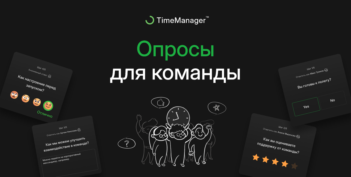 Создавая TimeManager, мы стремились помочь руководителям не только получать точные данные по рабочему времени команды, но и лучше понимать, что думают и чувствуют сотрудники. Именно поэтому мы разработали систему опросов: в любой момент руководитель может создать опрос на любую тему и получить честную обратную связь в конце рабочего дня.