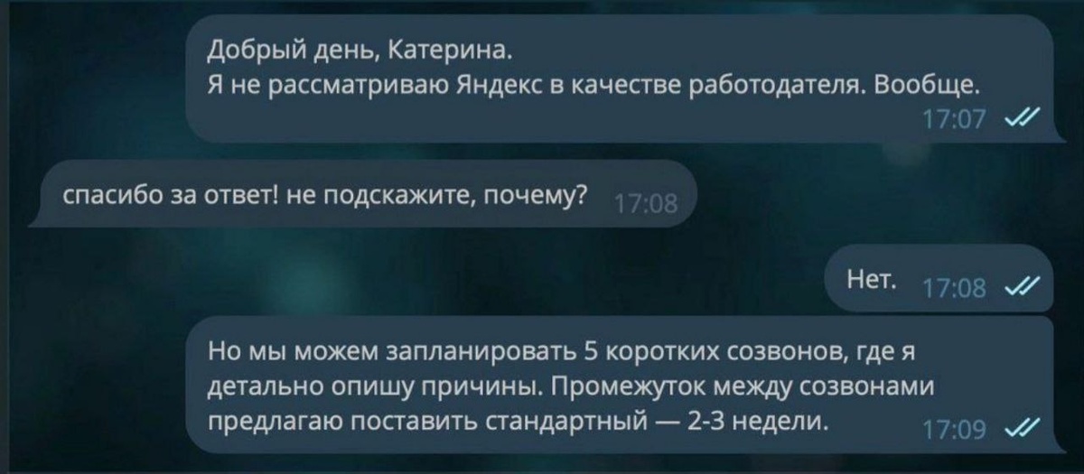 Ага, ага. А потом этот умник долбится в вакансии среди остальных 600 откликов и ноет в соц.сетях, что рынок не очень... Ало, ребята, давайте уже признаемся, что сейчас сильно легче найти работу на производстве, чем в ИТ. Короче, не время выпендриваться :) Русский ИТ бизнес