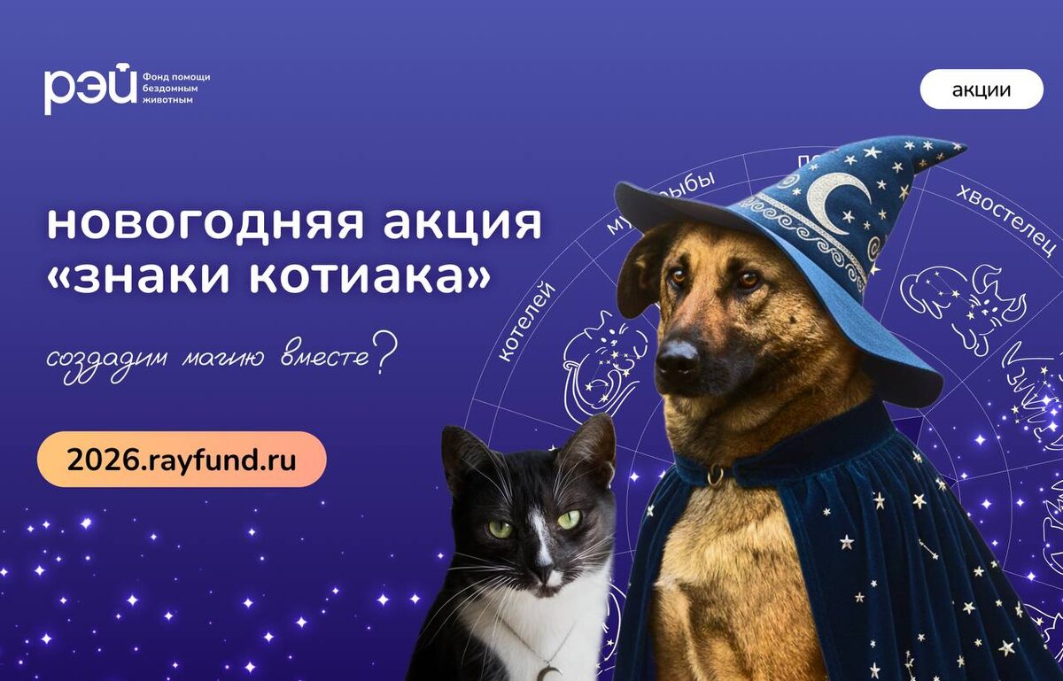 🔮 А вы верите в чудеса и магию? Тогда приглашаем вас стать настоящим волшебником и исполнить мечты животных из приютов! Переходите на сайт акции «Знаки котиака», чтобы познакомиться с собаками и кошками из приютов. У каждого из них своё созвездие и пожелание на следующий год! Если вы исполните мечту любого из наших героев, то получите набор стикеров для Telegram и коллекцию новогодних обоев на телефон. А за пожертвование от 260 рублей вы станете участником большого новогоднего розыгрыша и сможете выиграть один из 10-ти сертификатов от Европейского ветеринарного центра номиналом 3000 рублей или один из трёх наборов мерча от нашего фонда! Розыгрыш состоится 19 января 2026 года в нашем Telegram-канале, победителей мы определим случайным образом. Сертификаты будут отправлены на электронную почту; доставка набора мерча оплачивается получателем. Волшебство начинается здесь!